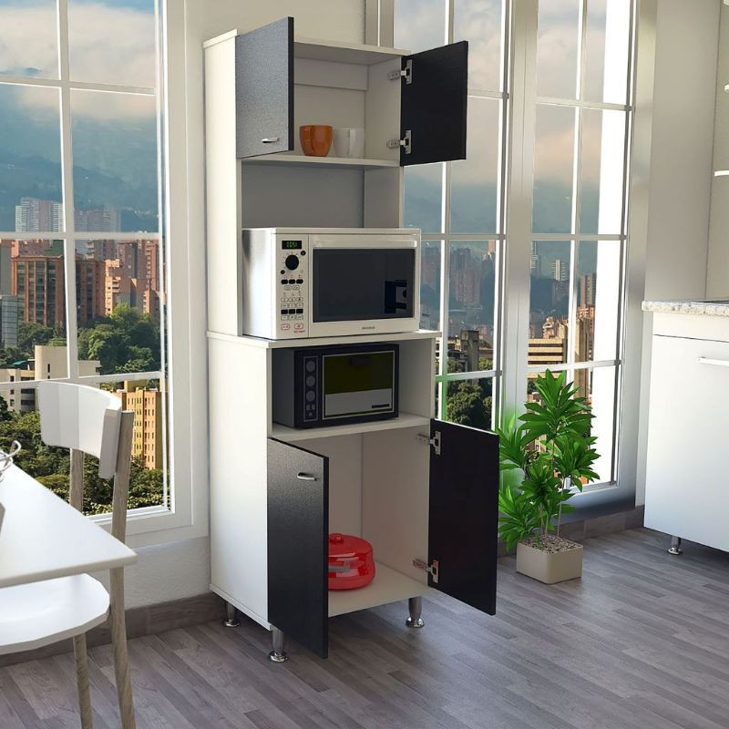 Alacena, con 4 puertas y espacio para microondas, patas y manijas metálicas.