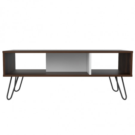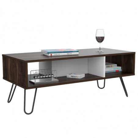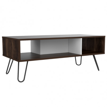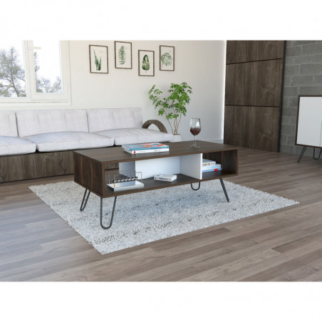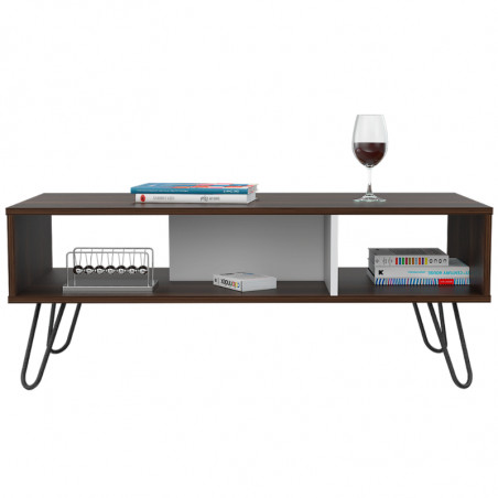 Mesa de Centro, con amplia superficie y patas de acero.