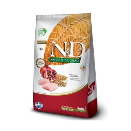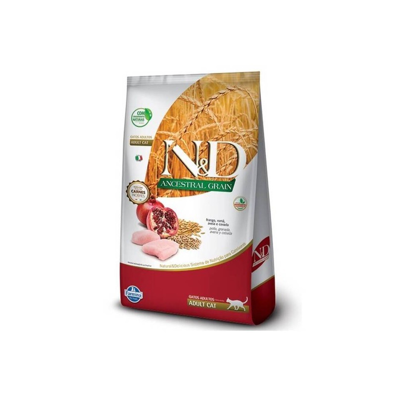 N&D Ancestral Gato Frango Adult Castrados 1,5 Kg Pollo, Granada, Avena y Cebada Alimento completo y balanceado para gatos adultos castrados COMPOSICIÓN carne de pollo (mecanicamente separada), harina de vísceras de aves (mín. 10%), huevo deshidratado, harina de pescado, harina de torrezno (proteína aislada de cerdo), sorgo, avena (mín. 0,5%), cebada (mín. 0,5%), aceite de pollo, aceite de pescado, pulpa de remolacha, cáscara de guisante, alfalfa deshidratada, lignocelulosa, semilla de psyllium, levadura seca de cervecería, zanahoria deshidratada, espinaca deshidratada, naranja deshidratada, manzana deshidratada, arándano deshidratado, extracto de granada (mín. 0,08%), extracto de té verde, extracto de aloe vera, cúrcuma em polvo, beta caroteno, aditivos prebióticos (FOS y MOS), DL-metionina, taurina, L-carnitina, sulfato de condroitina, sulfato de glucosamina, aditivos adsorbentes (extracto de yucca y zeolita), hidrolizado de hígado de pollo y cerdo, vitaminas (A, D3, E, B1, B2, B6, B12, C, biotina, niacina, ácido pantoténico, ácido fólico, cloruro de colina), fosfato bicálcico, aditivo acidificante, carbonato de calcio, cloruro de potasio, hierro aminoácido quelato, cobre aminoácido quelato, zinc aminoácido quelato, manganeso aminoácido quelato, proteinato de selenio, yodato de calcio, propionato de calcio, concentrado de tocoferoles. Eventual sustitutivo: proteína hidrolisada de pescado ENRIQUECIMIENTO MÍNIMO POR KG vitamina A 18.700UI; vitamina D3 1.250UI; vitamina E 510UI; vitamina B1 8,4mg; vitamina B2 17mg; vitamina B6 6,5mg; vitamina B12 80mcg; vitamina C 255mg; biotina 1,25mg; niacina 127mg; ácido pantoténico 42mg; ácido fólico 1,25mg; colina 2.400mg; hierro 80mg; cobre 15mg; zinc 145mg; manganeso 48mg; selenio 0,15mg; yodo 1,5mg. NIVELES DE GARANTÍA Humedad (máx.) 9%; Proteína Bruta (mín.) 38%; Extracto Etéreo (mín.) 10%; Materia Fibrosa (máx.) 5,5%; Materia Mineral (máx.) 8,3%; Calcio (mín.) 0,8%; Calcio (máx.) 1,4%; Fósforo (mín.) 0,8%; Sodio (mín.) 2.000mg/kg; Potasio (mín.) 5.000mg/kg; Magnesio (mín.) 900mg/kg; Omega 6 (mín.) 15g/kg; Omega 3 (mín.) 2.500mg/kg; DHA (mín.) 575mg/kg; EPA (mín.) 480mg/kg; Fructo-Oligosacáridos (mín.) 400mg/kg; Manano-Oligosacáridos (mín.) 240mg/kg; Metionina (mín.) 7.500mg/kg; Taurina (mín.) 2.000mg/kg; L-Carnitina (mín.) 100mg/kg; Lisina (mín.) 14g/kg; Sulfato de Condroitina (mín.) 200mg/kg; Sulfato de Glucosamina (mín.) 300mg/kg. VALOR ENERGÉTICO EM Kcal/Kg 3557 - Mj/Kg 14,88