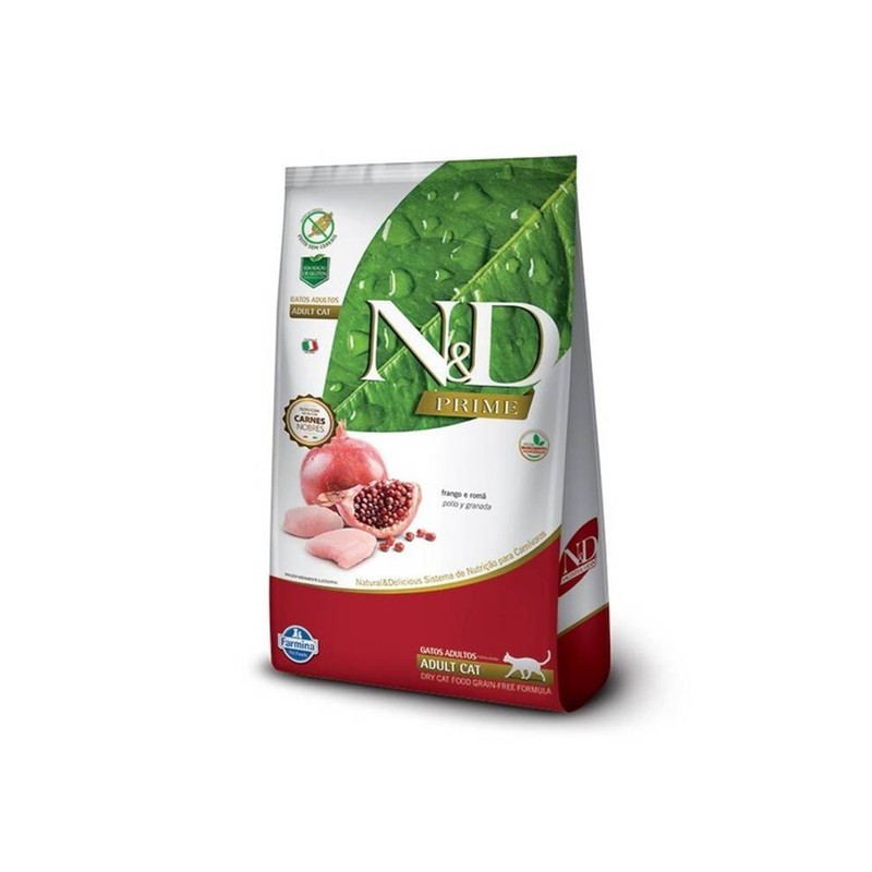 N&D Prime Gato Frango Adult 1,5 Kg Pollo y Granada Alimento completo y balanceado para gatos adultos COMPOSICIÓN carne de pollo (mecánicamente separada), harina de vísceras de aves (mín. 10%), huevo deshidratado, harina de pescado, harina de torrezno (proteína aislada de cerdo), almidón de papa, almidón de mandioca, aceite de pollo, aceite de pescado, pulpa de remolacha, cáscara de guisante, alfalfa deshidratada, lignocelulosa, semilla de psyllium, levadura seca de cervecería, zanahoria deshidratada, espinaca deshidratada, naranja deshidratada, manzana deshidratada, arándano deshidratado, extracto de granada (mín. 0,08%), extracto de té verde, extracto de aloe vera, cúrcuma en polvo, beta caroteno, aditivos prebióticos (FOS y MOS), DL-metionina, taurina, L-carnitina, sulfato de condroitina, sulfato de glucosamina, aditivos adsorbentes (extracto de yucca y zeolita), hidrolizado de hígado de pollo y cerdo, vitaminas (A, D3, E, B1, B2, B6, B12, C, biotina, niacina, ácido pantoténico, ácido fólico, cloruro de colina), cloruro de potasio, hierro aminoácido quelato, cobre aminoácido quelato, zinc aminoácido quelato, manganeso aminoácido quelato, proteinato de selenio, yodato de calcio, propionato de calcio, concentrado de tocoferoles. Eventual sustitutivo: proteína hidrolizada de pescado ENRIQUECIMIENTO MÍNIMO POR KG vitamina A 18.700UI; vitamina D3 1.250UI; vitamina E 510UI; vitamina B1 8,4mg; vitamina B2 17mg; vitamina B6 6,5mg; vitamina B12 80mcg; vitamina C 255mg; biotina 1,25mg; niacina 127mg; ácido pantoténico 42mg; ácido fólico 1,25mg; colina 2.400mg; hierro 40mg; cobre 13mg; zinc 145mg; manganeso 48mg; selenio 0,15mg; yodo 1,5mg. NIVELES DE GARANTÍA Humedad (máx.) 8%; Proteína Bruta (mín.) 44%; Extracto Etéreo (mín.) 20%; Materia Fibrosa (máx.) 1,8%; Materia Mineral (máx.) 8,5%; Calcio (mín.) 0,8%; Calcio (máx.) 1,5%; Fósforo (mín.) 0,8%; Sodio (mín.) 2.000mg/kg; Potasio (mín.) 5.000mg/kg; Magnesio (mín.) 900mg/kg; Omega 6 (mín.) 25g/kg; Omega 3 (mín.) 3.000mg/kg; DHA (mín.) 900mg/kg; EPA (mín.) 700mg/kg; Taurina (mín.) 2.000mg/kg; L-Carnitina (mín.) 100mg/kg; Metionina (mín.) 8.000mg/kg; Lisina (mín.) 14g/kg; Sulfato de Glucosamina (mín.) 300mg/kg; Sulfato de Condroitina (mín.) 200mg/kg; Manano-Oligosacáridos (mín.) 400mg/kg; Fructo-Oligosacáridos (mín.) 600mg/kg. VALOR ENERGÉTICO EM Kcal/Kg 4132 - Mj/Kg 17,29