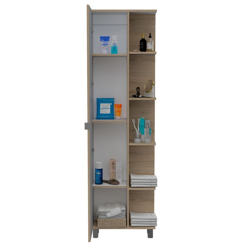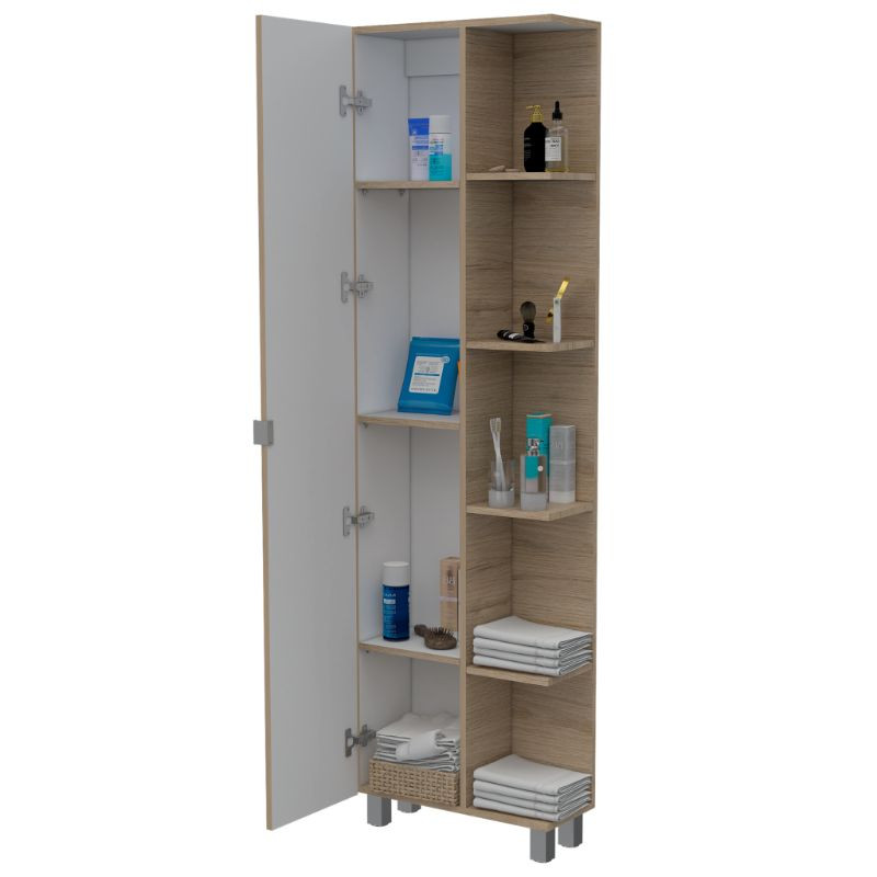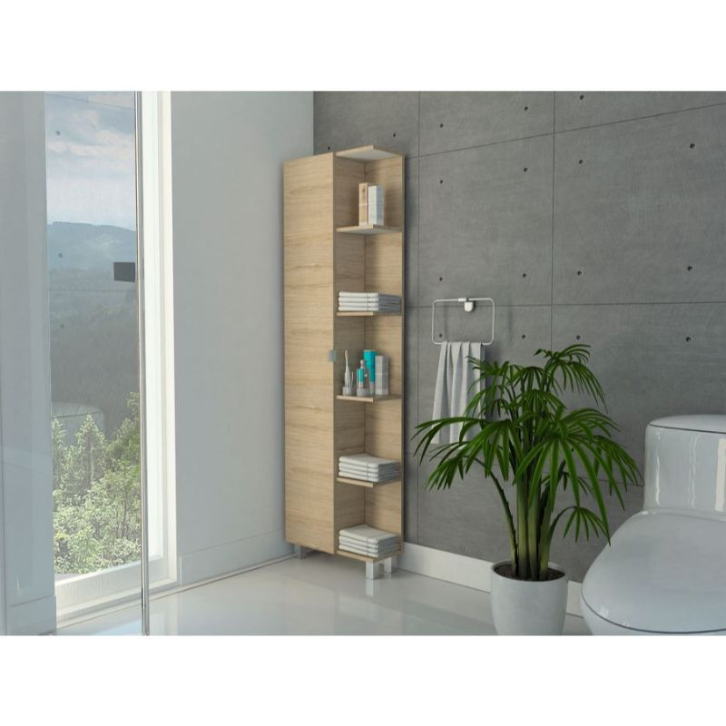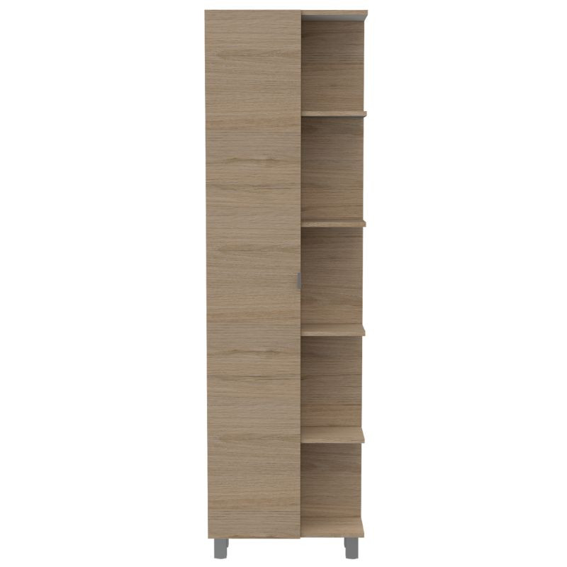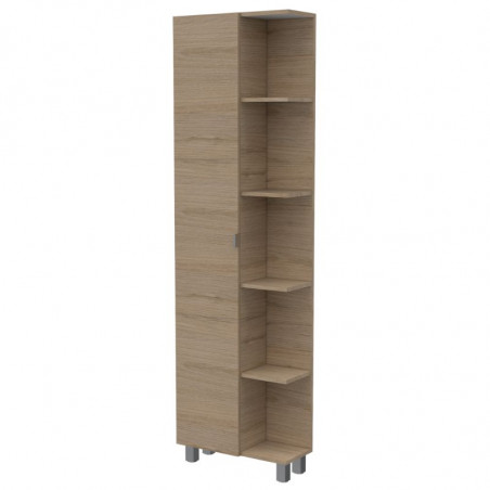 Mueble esquinero, con 1 puerta, 5 entrepaños dobles y patas metálicas.
