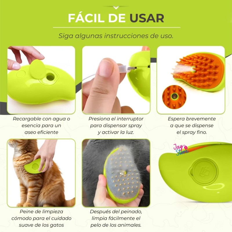 No solo desenreda el pelaje, sino que también ofrece una experiencia de masaje relajante para perros y gatos. Su tecnología de vapor ayuda a suavizar el pelo, facilitando el peinado y reduciendo los nudos, al tiempo que hidrata y mejora la salud del pelaje. Con carga USB, es práctico y portátil, ideal para usar en casa o llevar de viaje.