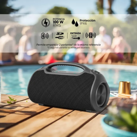 Vive una experiencia de sonido completa con el parlante Kalley K-PBOOMPLUS. Con 100W de potencia, woofer, tweeter y radiadores pasivos, obtendrás un audio potente y de gran calidad. Su batería de larga duración y su diseño resistente lo hacen ideal para cualquier ocasión. Disfruta de tus playlists favoritas por Bluetooth o a través de sus múltiples entradas, y activa el modo karaoke para compartir momentos inolvidables.