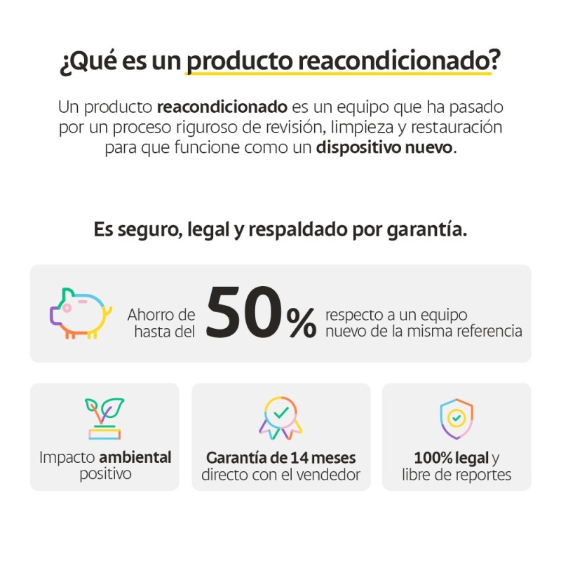 iPhone 12 Reacondicionado El iPhone 12 combina diseño, potencia y fotografía en un dispositivo equilibrado. Equipado con el chip A14 Bionic y una pantalla Super Retina XDR OLED de 6.1 pulgadas, ofrece fluidez y colores brillantes con eficiencia energética. Su cámara dual de 12 MP permite capturar fotos detalladas y videos en calidad cinematográfica con Modo Noche en todas las lentes. En Refurbi, cada equipo es reacondicionado, probado y certificado para garantizar un funcionamiento óptimo, con hasta 14 meses de garantía. Garantía Refurbi Hasta 14 meses de garantía Características del iPhone 12 Pantalla Tipo: Super Retina XDR OLED Tamaño: 6.1 pulgadas Resolución: 2532 × 1170 píxeles Brillo máximo: 625 nits (1200 nits HDR) Procesador y Rendimiento Chip: Apple A14 Bionic (5 nm) CPU: Hexa-core (2x Firestorm + 4x Icestorm) GPU: Apple 4-core graphics RAM: 4 GB Almacenamiento: 64 GB / 128 GB / 256 GB Cámaras Trasera dual: Principal: 12 MP (f/1.6, OIS) Ultra gran angular: 12 MP (f/2.4, 120°) Video: 4K a 24/30/60 fps | 1080p a 120/240 fps | HDR Dolby Vision Frontal: 12 MP (f/2.2, HDR, Modo Noche) Batería y Carga Capacidad: 2815 mAh Carga rápida: 20 W (cable) Carga inalámbrica MagSafe: 15 W Puerto: Lightning Conectividad y Extras 5G / 4G LTE Wi-Fi 6, Bluetooth 5.0, NFC Face ID, giroscopio, altavoces estéreo Dual SIM (nano + eSIM) Sistema Operativo iOS 14 (actualizable a versiones posteriores) ¿Por Qué Elegir el iPhone 12? Chip A14 Bionic con gran eficiencia y velocidad Cámara dual con Modo Noche y video HDR Dolby Vision Pantalla OLED de alta resolución con contraste profundo Diseño elegante con bordes planos Hasta 14 meses de garantía Refurbi Beneficios de Comprar en Refurbi Smartphone reacondicionado, probado y certificado Compatible con cualquier operador Hasta 14 meses de garantía y devolución en 30 días Precio más bajo que uno nuevo, sin sacrificar calidad Contribuyes a un consumo más sostenible Nota Puede presentar leves signos de uso que no afectan su funcionamiento. Equipo 100 % funcional y listo para usar. Contenido de la Caja iPhone 12 Cable Lightning a USB-C Cargador Refurbi Documentación