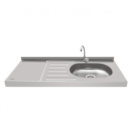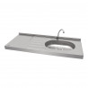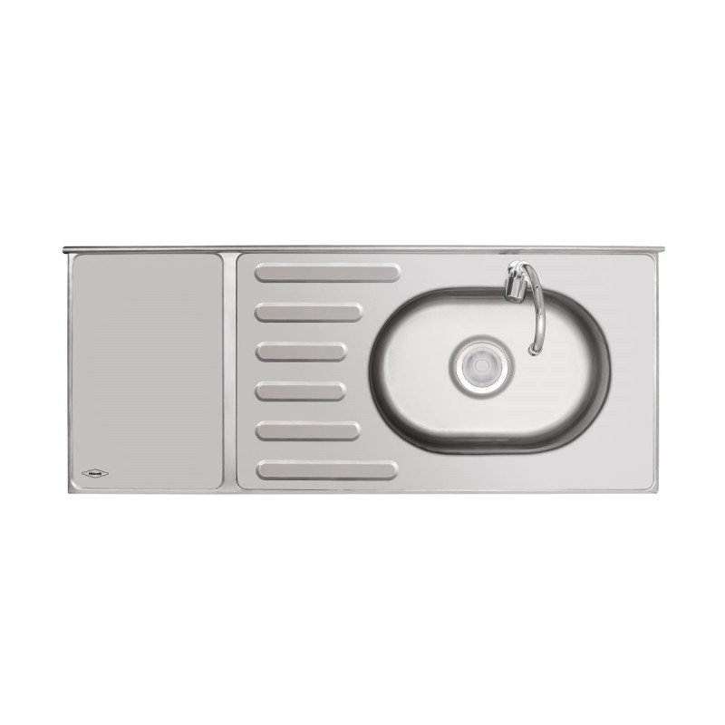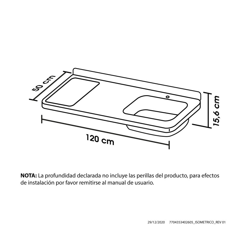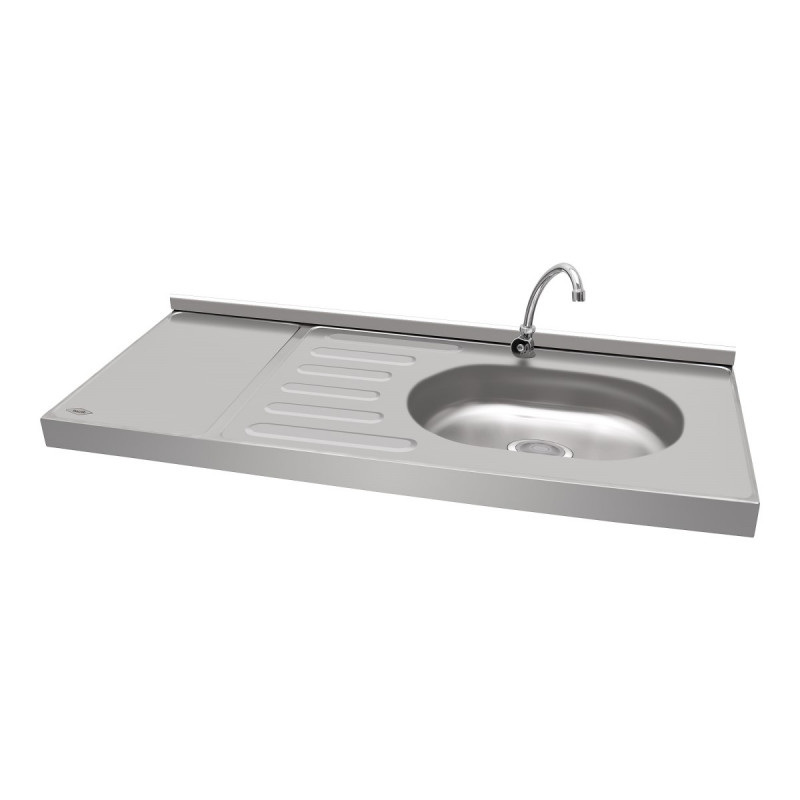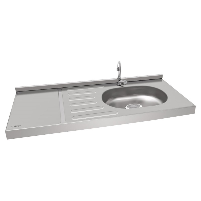 Mesón en acero inoxidable de 1.20 metros de ancho, con ubicación derecha del pozuelo. Cuenta con lavaplatos, zona de prensado en el centro que evita la filtración de líquidos al mueble y amplia área de preparación.