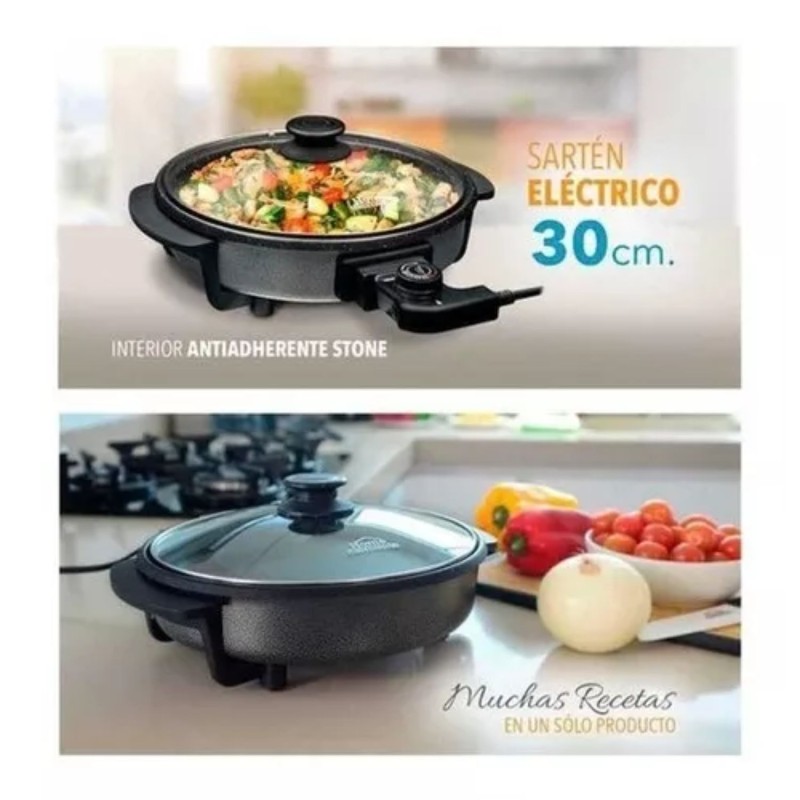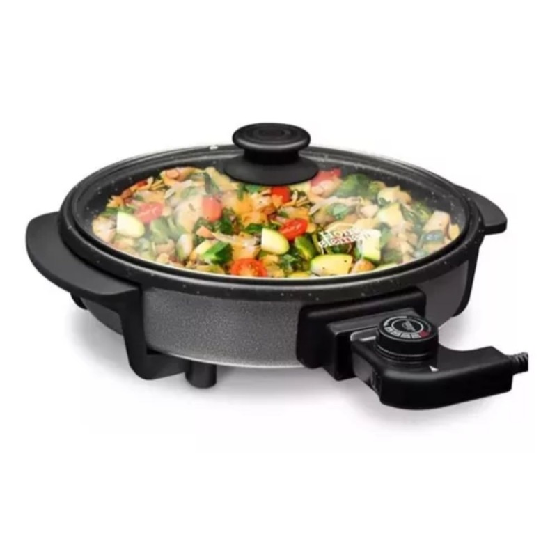 Este sartén tiene un interior antiadherente. Cocina alimentos sabrosos y saludables sin preocuparte de que se peguen, gracias a su revestimiento antiadherente de piedra, con doble capa. Viene con una tapa de vidrio que tiene un regulador de vapor para evitar posibles derrames. Puedes controlar la temperatura hasta 250ºC, gracias a su regulador. Elige la temperatura perfecta según el tipo de comida. Además, el sartén tiene asas laterales que aíslan el calor para evitar accidentes. Tiene una potencia de 1.200 w. 120 V - 60 Hz.