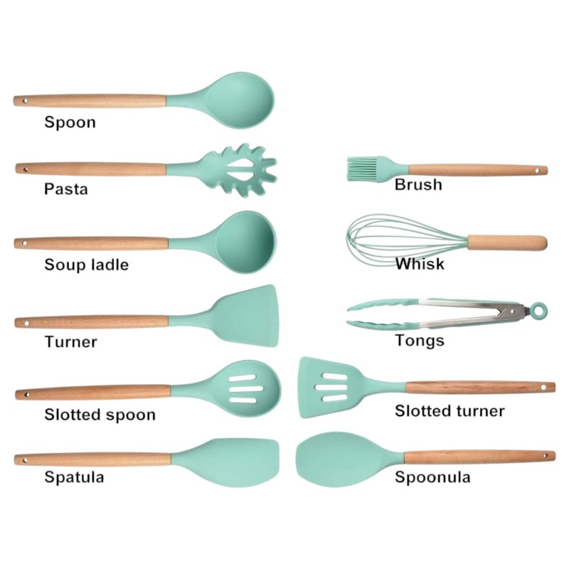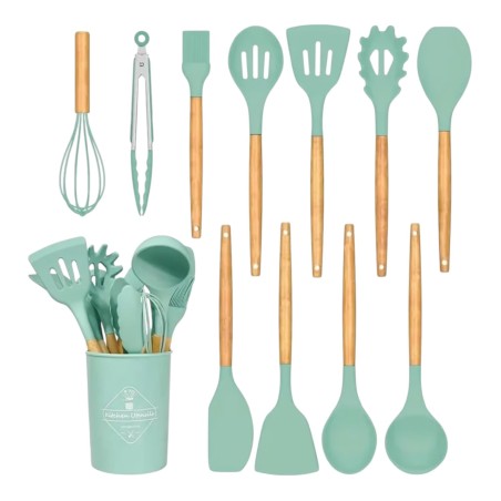 Set Completo: Incluye 12 piezas esenciales para la cocina: cucharas, espátulas, batidor de mano, pinzas, brocha de cocina y más.