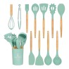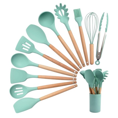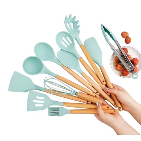 ¡Dale un toque moderno y elegante a tu cocina en casa con este completo set de utensilios de cocina! Elaborados con silicona de alta calidad y mangos de madera, estos utensilios combinan estilo, funcionalidad y durabilidad. Ideales para cocinar sin rayar tus ollas y sartenes gracias a su diseño antiadherente.