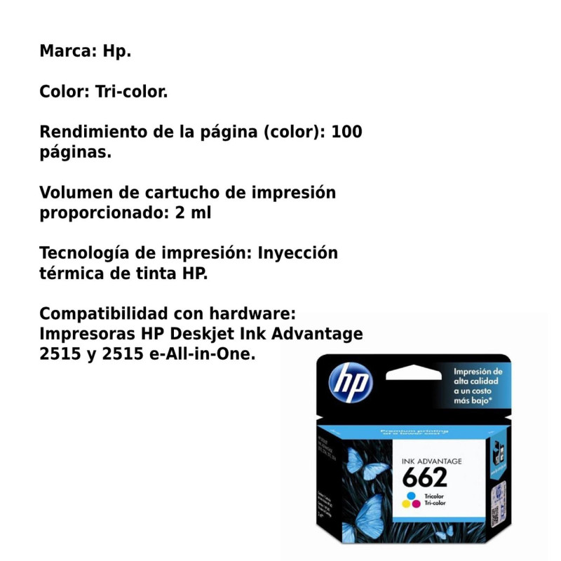 Volumen de cartucho 662 (Tricolor): 2ml.