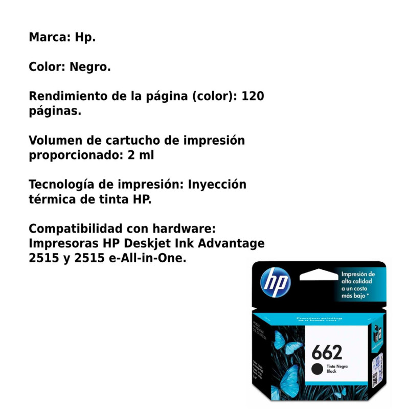 Volumen de cartucho 662 (Negro): 2ml.