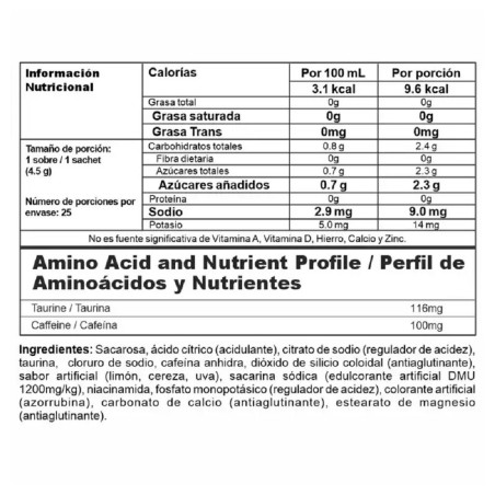 Bebida energizante, contiene cafeína y taurina. Aporta solo 8 calorías. Ideal para consumir como pre entreno, contiene 25 sachets por envase. Sabor frutos rojos.