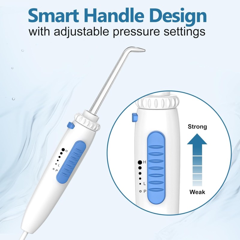 · 5 modos de Limpieza Ajustables: Personaliza tu experiencia de limpieza con 5 ajustes de presión de agua, que varían de 110 PSI, para adaptarse perfectamente a la sensibilidad de tus encías y dientes. Además, su diseño intuitivo incluye un interruptor en el mango que permite controlar el flujo de agua con facilidad, pausándolo o activándolo con un simple empujón. Esto facilita una limpieza eficaz, adaptada a tus necesidades y comodidad.