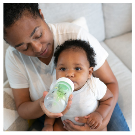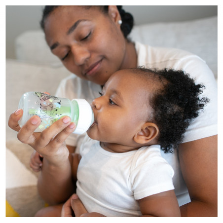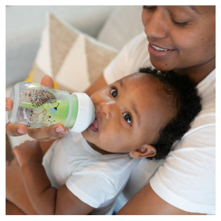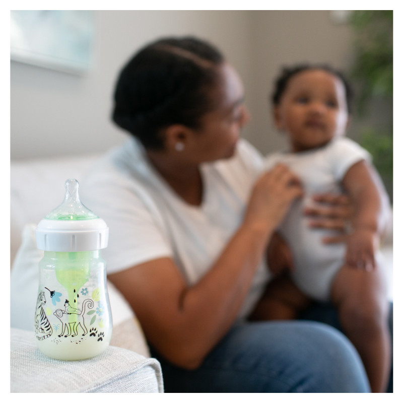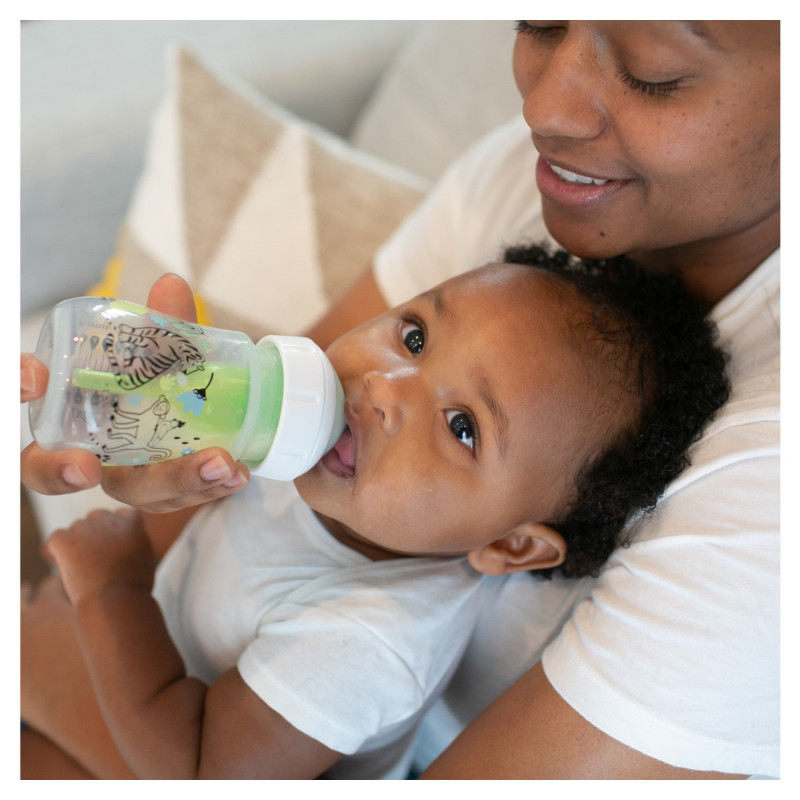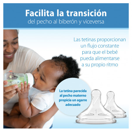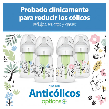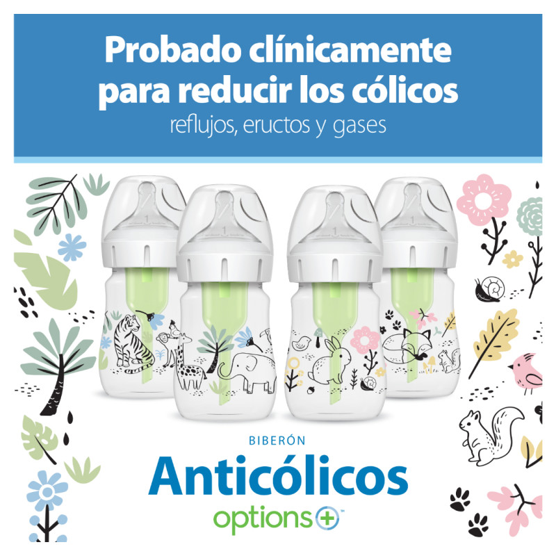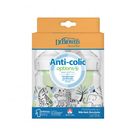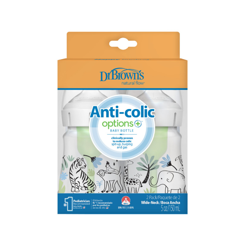Los teteros Dr. Brown's® brindan una experiencia de alimentación más cómoda para el bebé al disminuir las regurgitaciones, los eructos y los gases, esta alimentación sin vacío es lo más parecido a amamantar y las tetinas de silicona de Dr. Browns® brindan un flujo constante para que el bebé pueda alimentarse a su propio ritmo; forma del chupo, similar a un seno, fomenta un agarre adecuado para una experiencia de alimentación con biberón más natural y facilita la transición del seno al biberón y viceversa. Se ha comprobado que el sistema de ventilación de Dr. Brown's ayuda a conservar los nutrientes de la leche del biberón y ayuda en la digestión para una mejor noche de sueño; la tetina de silicona, junto con el sistema de ventilación interna, ofrecen una experiencia de alimentación con biberón fiable y de confianza que convierte al Dr. Brown's en el biberón N.º 1 recomendado por pediatras en los EE. UU.* Hecho para crecer con el bebé, nuestro biberón está diseñado para nutrir a través de las etapas de alimentación del bebé y es reciclable. Seguro para usar en lavavajillas (solo en la rejilla superior), esterilizadores eléctricos y de microondas o agua hirviendo. Libres de BPA. PRESENTACIÓN BOCA ANCHA 5 ONZAS. Este lindo set de teteros de Dr. Brown's viene en presentación de 5 onzas decorado con divertidos motivos de la jungla. TETERO ANTICÓLICOS. El sistema de ventilación interna anticólico está clínicamente probado para reducir los cólicos. Disminuye las regurgitaciones, los eructos y los gases. TASA DE FLUJO CONSISTENTE. La alimentación sin vacío es lo más parecido a amamantar y las tetinas de silicona del Dr. Brown's brindan un flujo constante para que los bebés puedan alimentarse a su propio ritmo. CONSERVA NUTRIENTES. Se ha comprobado que el sistema de ventilación anticólicos ayuda a conservar los nutrientes de la leche del tetero y ayuda en la digestión para una mejor noche de sueño. TETERO DE LACTANCIA MATERNA. La forma del pezón, similar a un seno, fomenta un agarre adecuado para una experiencia de alimentación con tetero más natural y facilita la transición del seno al tetero y viceversa. EL TETERO CRECE CON EL BEBÉ. El tetero Dr. Brown's Natural Flow Anti-Colic Options+ funciona mejor con el sistema de ventilación interno colocado, pero se puede quitar a medida que el bebé se alimenta, sin necesidad de introducir un tetero diferente. TETERO SOSTENIBLE. El tetero de cuello ancho de Dr. Brown está diseñado para nutrir a través de todas las etapas de alimentación del bebé y es reciclable. APTAS PARA EL LAVAVAJILLAS. Seguro para usar en lavavajillas (solo en la rejilla superior), esterilizadores eléctricos y de microondas o agua hirviendo. Sin BPA.
