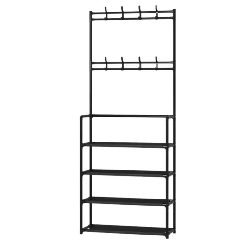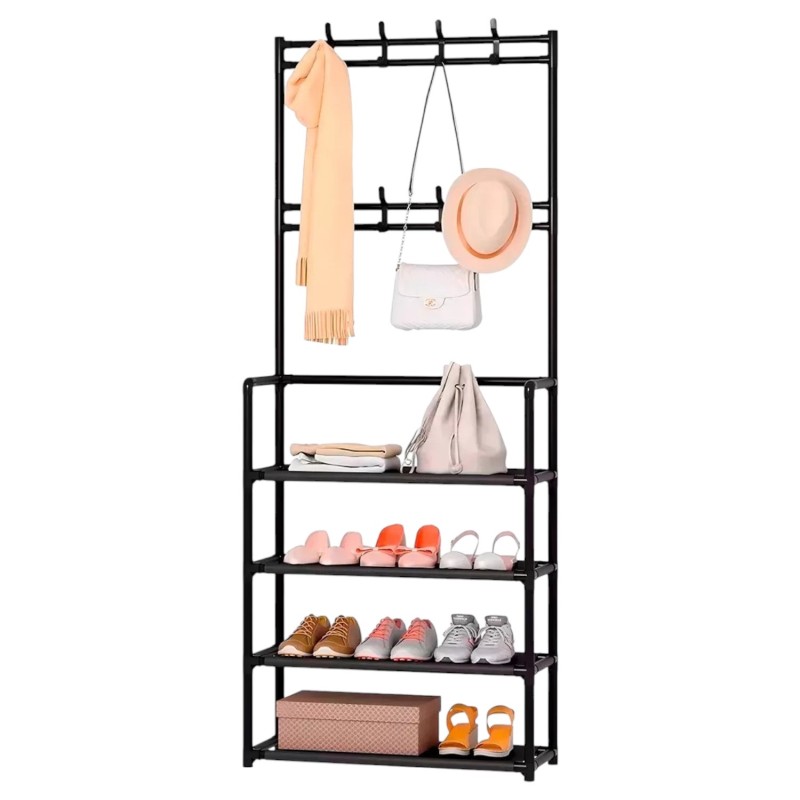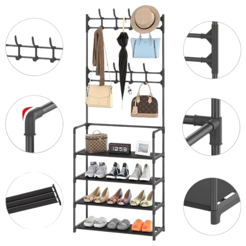 Este mueble combina funcionalidad y estilo, ofreciendo ganchos superiores para colgar abrigos, sombreros y bolsos, además de amplias repisas para guardar calzado y otros objetos. Su diseño moderno y minimalista en color negro se adapta a cualquier decoración.