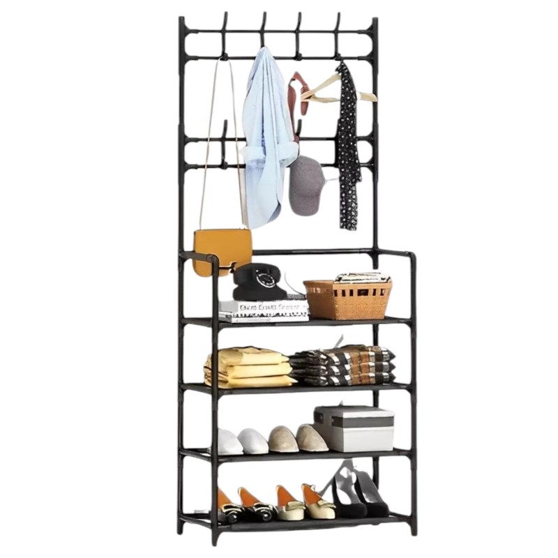 Mantén tu hogar organizado con este zapatero y perchero multiuso, ideal para maximizar el espacio en la entrada, habitación o vestidor. Su estructura resistente en metal brinda estabilidad y durabilidad, mientras que su diseño vertical te permite almacenar zapatos, bolsos, ropa y accesorios de manera eficiente.