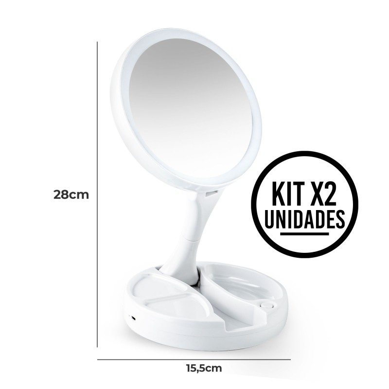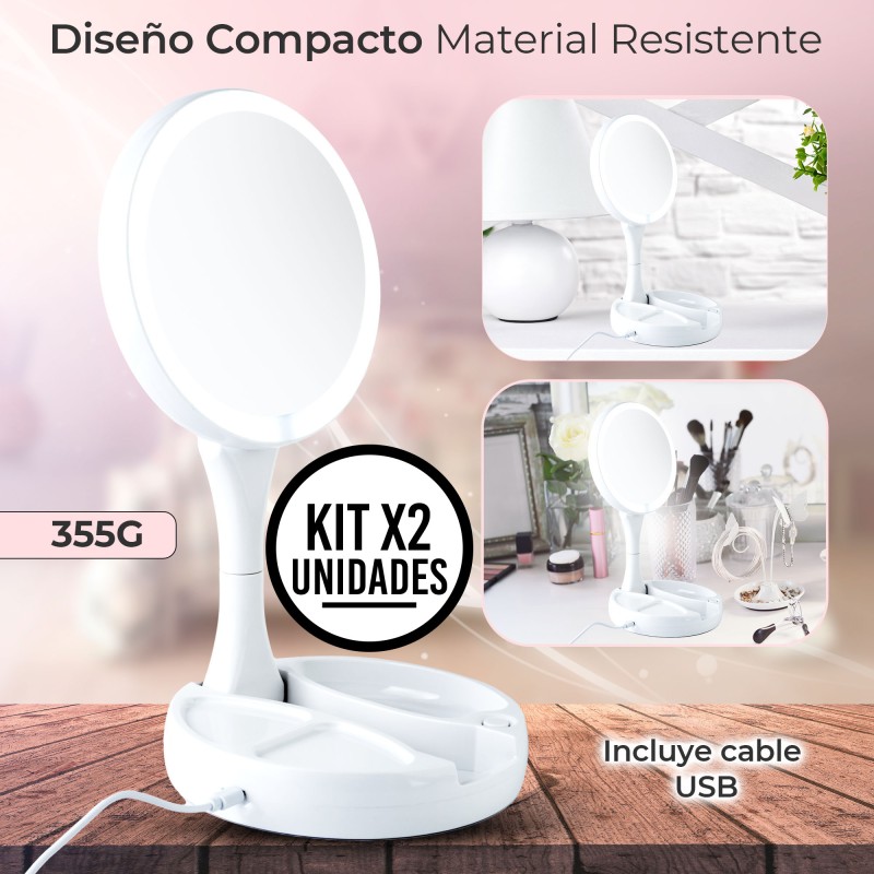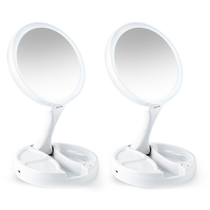 2 Espejos de maquillaje LED plegables, cada uno con: