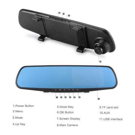 Espejo retrovisor con grabadora digital de vídeo (DVR). Cámara frontal incorporada al espejo que permite grabar el trayecto recorrido. Dispone de un slot para tarjeta de memoria que soporta hasta 32GB. Se alimenta con 12v del encendedor del vehículo. La pantalla incorporada es de 4.3”. Se adapta al espejo original del vehículo. Además, cuenta con una cámara de retroceso para facilitar el estacionamiento. NOTA: La cámara NO es resistente al agua, la instalación debe ser interna. ¿PARA QUÉ SIRVE EL PRODUCTO? Con este espejo podrás grabar todo tu camino gracias a su cámara Full HD que permite un ángulo de visión de 170°. También cuenta con una cámara de reversa de fácil instalación para evitar rayar el parachoques al estacionar, y sensor de movimiento que se activa cuando alguien se acerca al auto estacionado. CARACTERÍSTICAS: • Pantalla de 4.3". • Cámara Delantera Full HD. • Cámara trasera 720p. • Soporta memorias hasta 32GB. • Control de parqueo. • Control de movimiento. • G sensor. • Espejo retrovisor con cámara. • Cámara de retroceso con soporte. • Cable de alimentación. • Slot para tarjeta de memoria. • Largo del cable (cámara trasera) de 6 mts aprox. • Ángulo de la lente: 120 grados. • Voltaje de la pila: 9dcv — 15dcv. • Voltaje nominal: DC 12 V. • Consumo: max 1 W. • Sensor de imagen: 1/3 CMOS. • Total de píxeles: 720 x 504 píxeles. • Resolución: 600 TVL (mejorada). • Mini iluminación: 0.1lux. • Salida de vídeo: CVBS 1.0 Vpp/75 ohm. CONTENIDO: • Espejo Retrovisor (la cámara delantera es parte del espejo). • Cámara de reversa. • Cable de corriente. • Cable para cámara trasera. • 2 soportes de caucho para instalar sobre el espejo retrovisor.