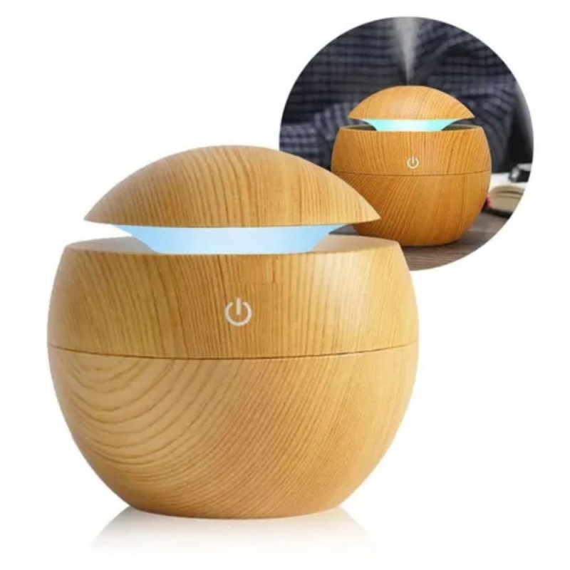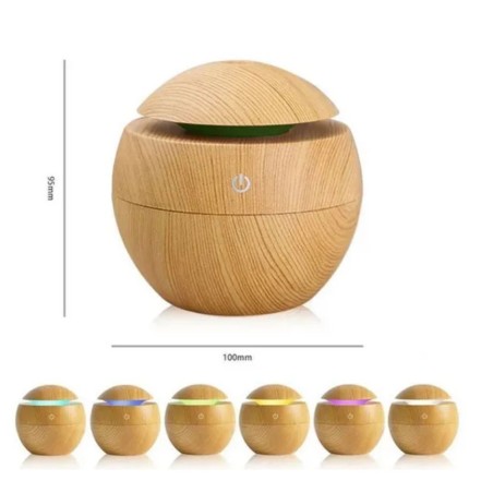 Humidificador con capacidad de 130?ml, ideal para uso en espacios pequeños como hogar u oficina. Su diseño compacto en acabado tipo madera lo convierte en una opción decorativa y funcional para ambientar cualquier habitación.