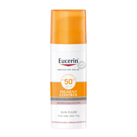 Eucerin Sun Fluid Pigment Control FPS 50+ es un protector solar facial diario para todo tipo de pieles que ayuda a prevenir la hiperpigmentación inducida por el sol. La avanzada tecnología espectral combina filtros UVA / UVB de banda ancha y fotosutables para obtener una protección UV muy alta con Licochalcone A para neutralizar los radicales libres causados por la luz UV y HEVIS. El protector solar anti-pigmento también incluye ácido glicirretínico, que es compatible con el mecanismo de reparación del ADN de la piel.