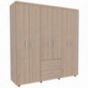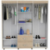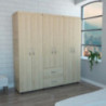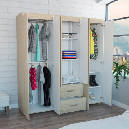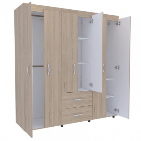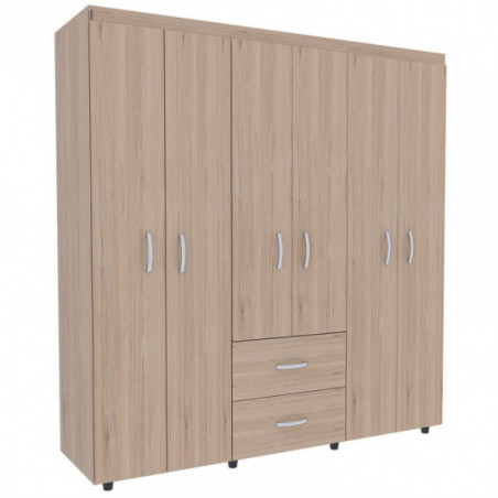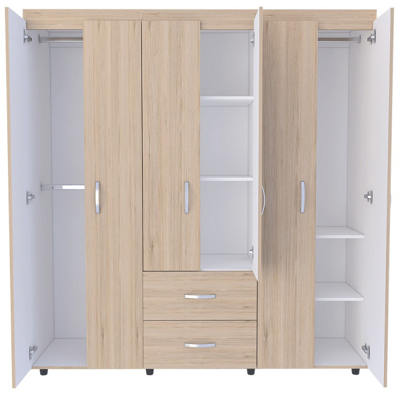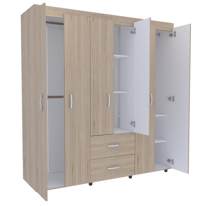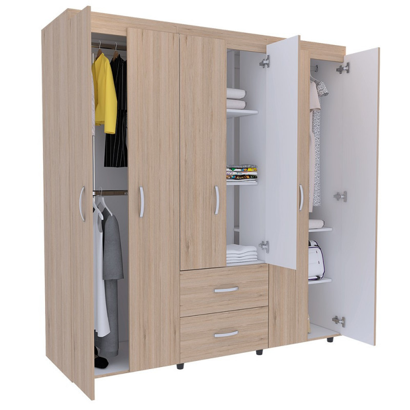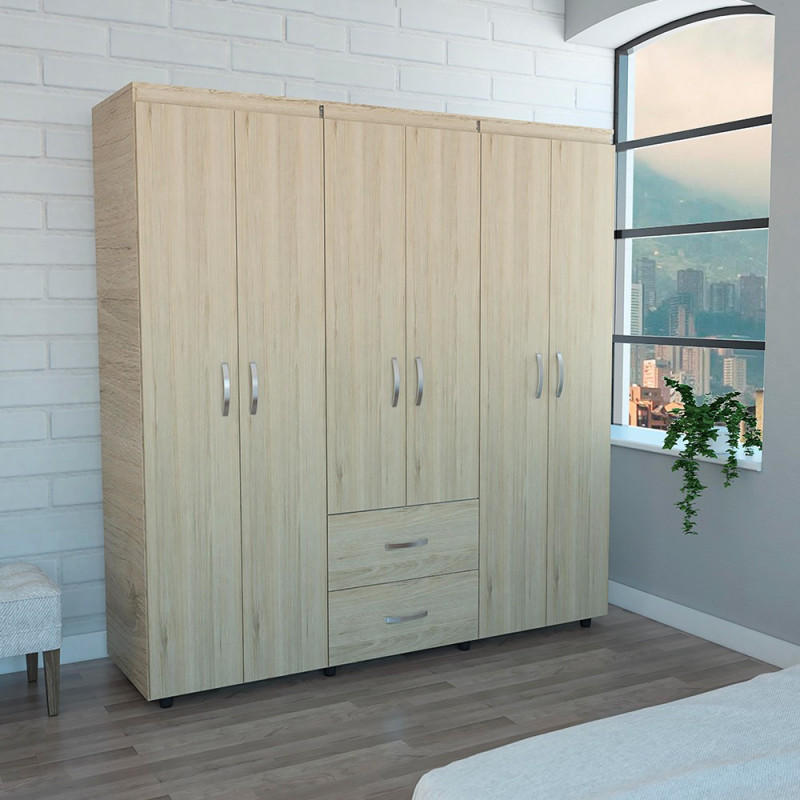 Closet con 6 puertas batientes, 2 cajones, tubos cromados para colgar ropa, entrepaños para ubicar zapatos, accesorios y otros. Deslizadores plásticos para apoyo al piso. Incluye manijas metálicas.