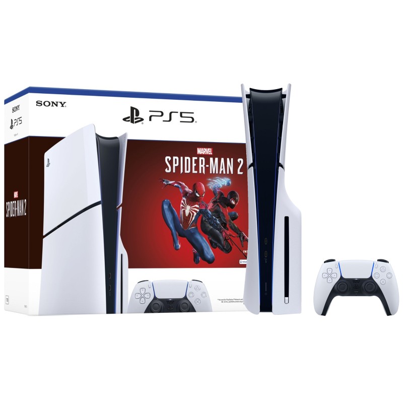 Contenido de la caja: Consola PS5 Slim, control DualSense, juego Spider-Man 2, cable HDMI, cable de poder, base de soporte