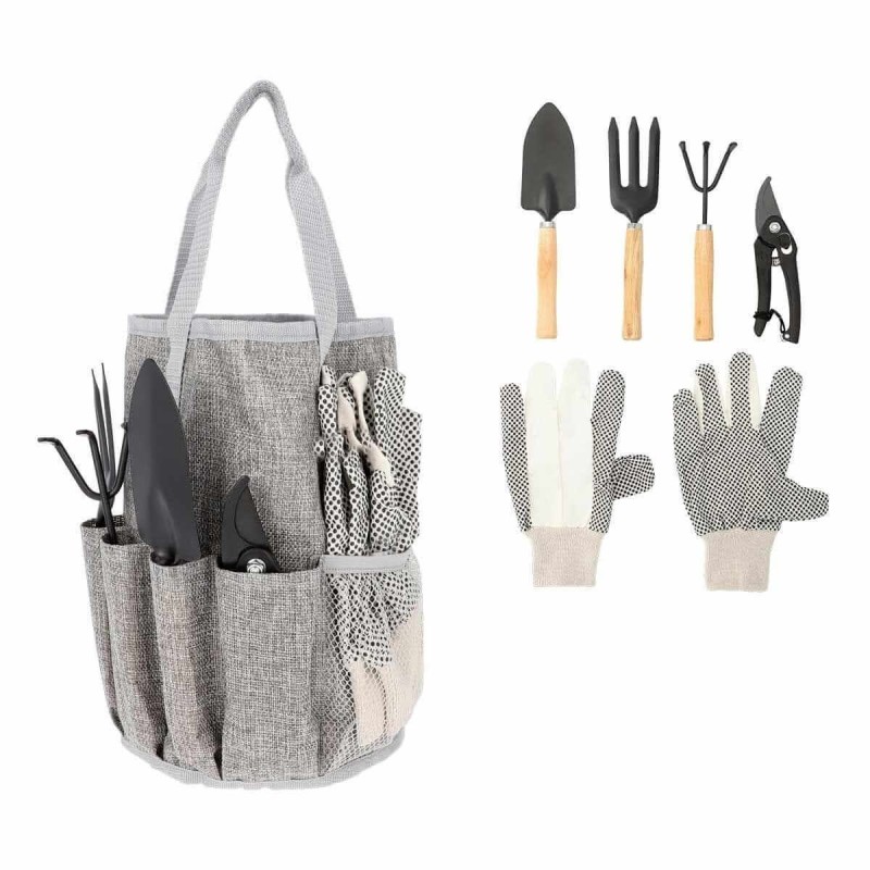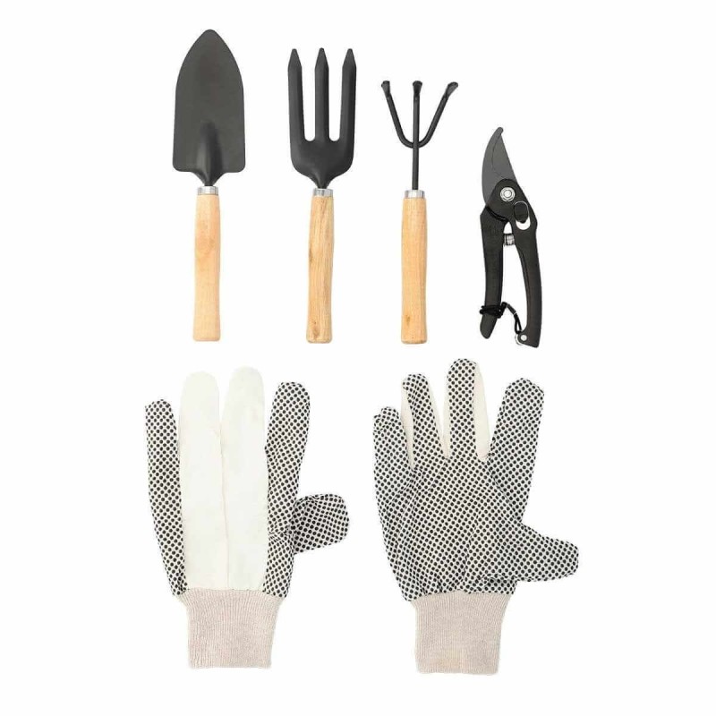 Set de jardín que incluye pinzas de corte, pala ancha, horqueta, rastrillo, guantes de algodón con antiderrapante y bolsa con asa.