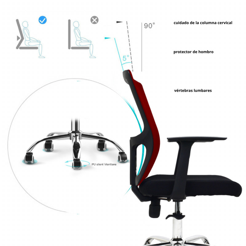 CUIDADOS DEL PRODUCTO: Limpiar la silla regularmente con un trapo seco para mantenerlo libre de polvo o mugre en general, no usar esponjillas, detergentes, solventas, hipoclorito o sustancias que puedan dañarlo. no se siente en los brazos o el espaldar del mueble.