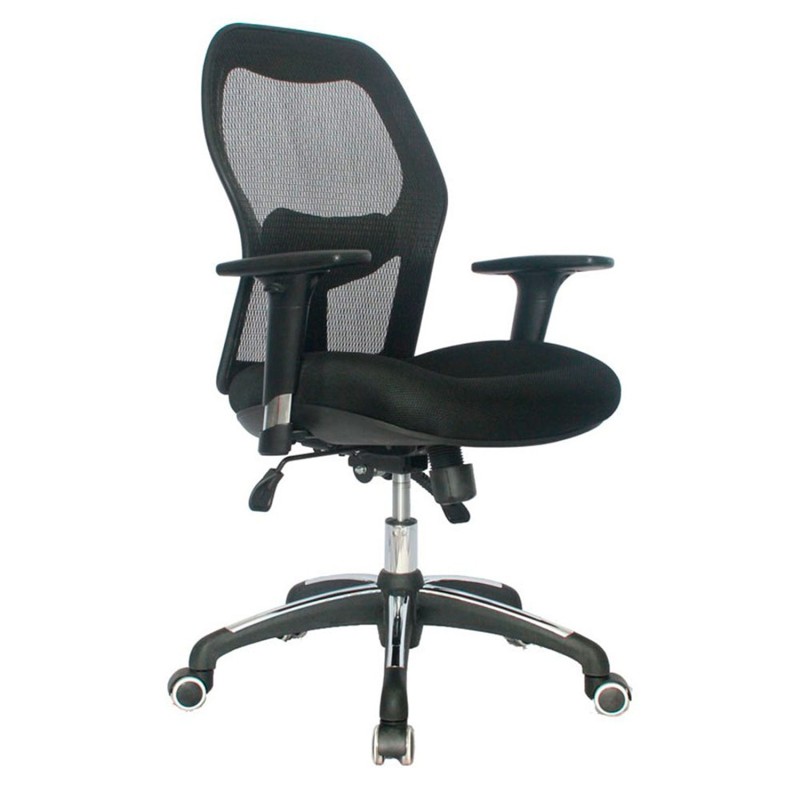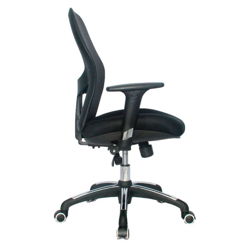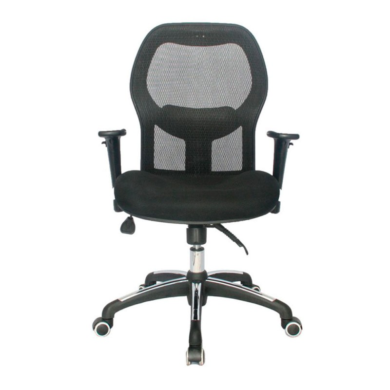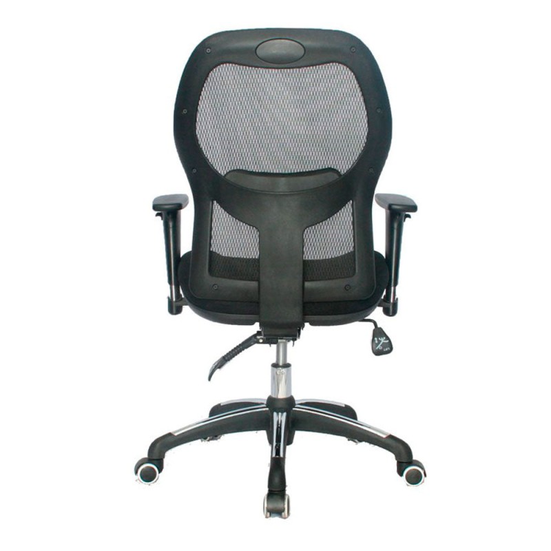 La Silla de Oficina Max Gerente cuenta con un espaldar alto con marco en polipropileno de alto impacto, tapizado en malla traslúcida de color negro, que brinda ventilación y soporte. El asiento está fabricado en espuma de alta densidad, tapizado en paño, y cuenta con graduación de altura mediante palanca que activa el cilindro neumático. Incorpora apoyo lumbar graduable en altura para mayor ergonomía. Su mecanismo sincro con 4 bloqueos permite diferentes posiciones de reclinación. Los brazos, en polipropileno, son regulables en altura. La base está elaborada en nylon reforzado con fibra de vidrio y acabados en cromo, y sus ruedas en goma permiten un desplazamiento suave y silencioso.