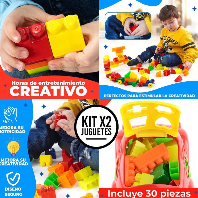 - Kit Educativo: Bloques x80 + Carro didáctico para niños. - Fomenta creatividad y desarrollo cognitivo: con construcciones infinitas. - Desarrollo Integral: Mejora habilidades motoras y cognitivas jugando. - Práctico: Bolsa plástica para fácil almacenamiento y transporte. - Especificaciones: Bloques x80 (29x22x15 cm, 0.36 kg), Carro (13x27x18 cm, 0.35 kg). - Regalo Ideal: Para aprender jugando, aumenta el aprendizaje lúdico.