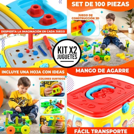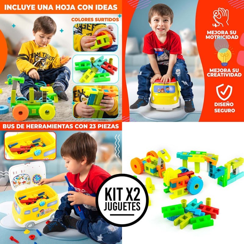 Revitaliza el tiempo de juego de tus hijos con nuestro Kit Constructor 3D + Autobús Herramientas: 123 Piezas de Juego, una combinación perfecta de diversión educativa y creatividad sin límites. Fabricado con Polipropileno seguro y resistente, este set es ideal para estimular la imaginación, el desarrollo cognitivo y las habilidades motoras de los más jóvenes. Este Kit Incluye: - Construcción 3D x100 Piezas: Para una infinita creatividad y aprendizaje. - Autobús Herramientas x23 Piezas: Para fomentar el aprendizaje interactivo y mejorar la coordinación. Beneficios: - Estimula la Imaginación y Creatividad: Con un total de 133 piezas coloridas. - Promueve el Desarrollo Cognitivo: A través del ensamblaje y la resolución de problemas. - Fomenta el Aprendizaje Interactivo: Mejorando la coordinación mano-ojo. Especificaciones: - Juego de Construcción 3D: 37x28x14 cm, 1.3 kg. - Autobús Herramientas: 22x32x19 cm, 1.25 kg. ¡Transforma el aprendizaje en una aventura! Este kit no solo proporciona horas de diversión, sino que también ofrece una experiencia educativa invaluable, perfecta para regalos y fomentar el juego en familia. Adquiere ahora este set y brinda a tus pequeños constructores las herramientas para imaginar, crear y aprender.