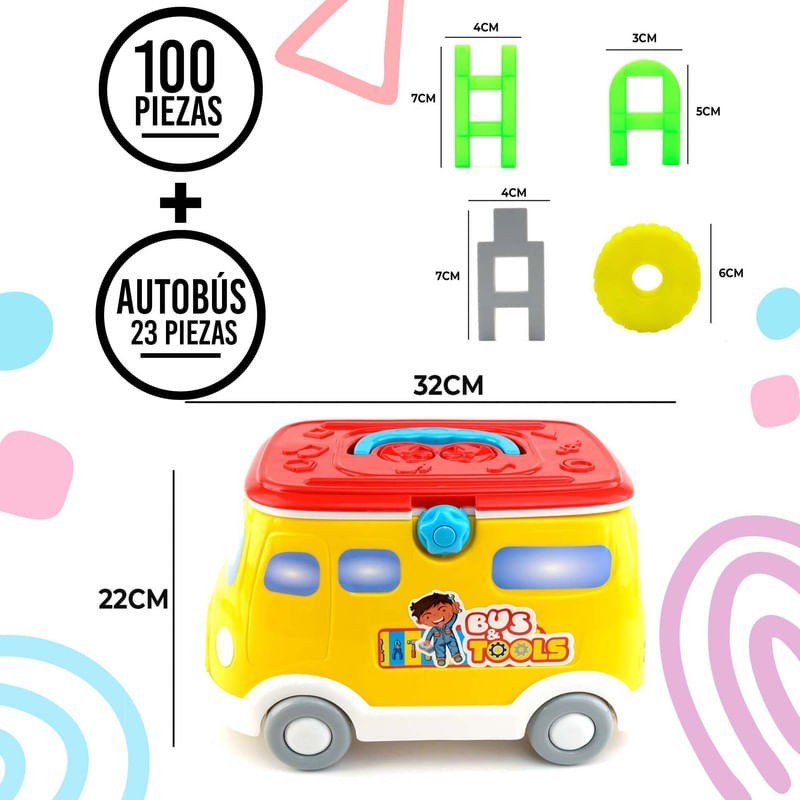 - Fomenta Creatividad: 100 piezas de construcción 3D y 23 piezas de autobús herramientas.