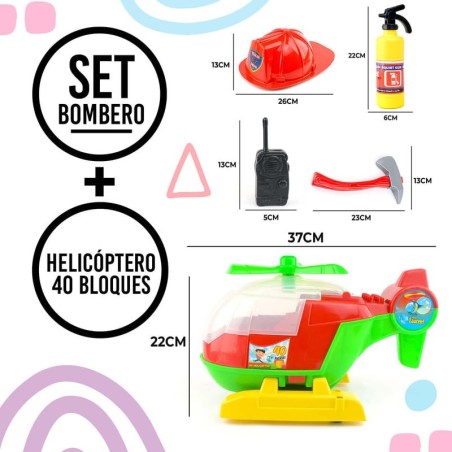 - El set de bombero viene con herramientas realistas; el helicóptero incluye 40 bloques para construcción.