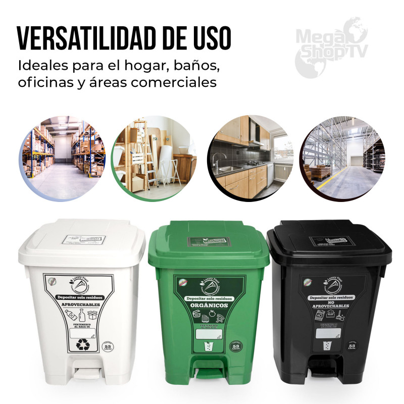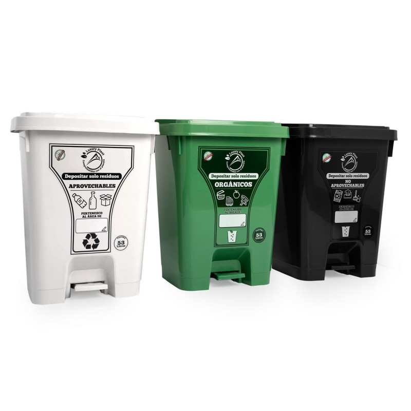 Con tres canecas de 53 litros cada una, fabricadas con polipropileno recuperado, este conjunto ofrece resistencia, durabilidad y un diseño práctico con pedal.