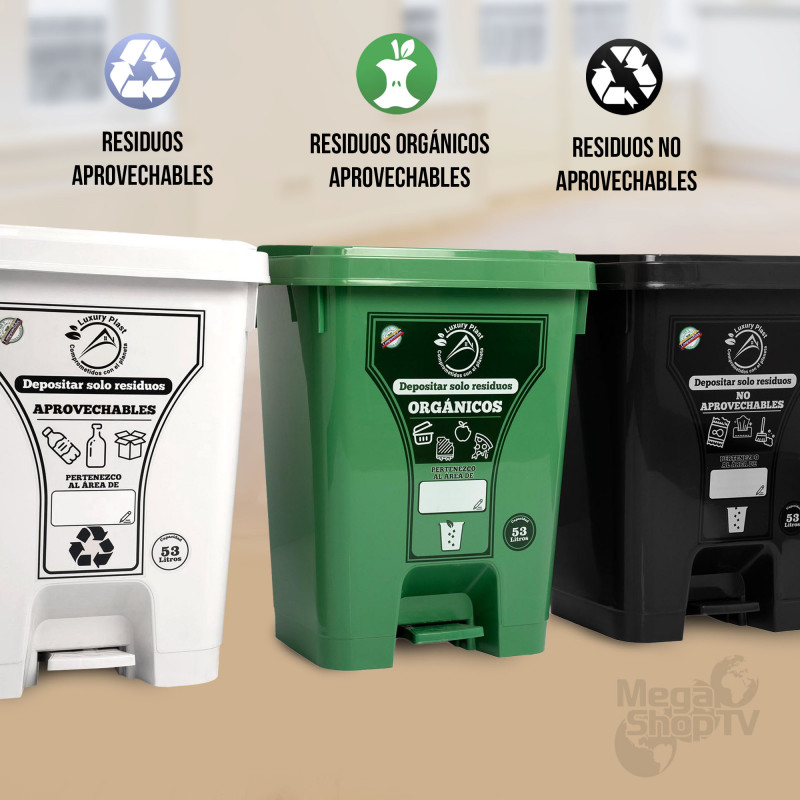 Este set incluye tres canecas de gran capacidad, cada una con 53 litros de espacio para separar tus residuos de forma eficiente.