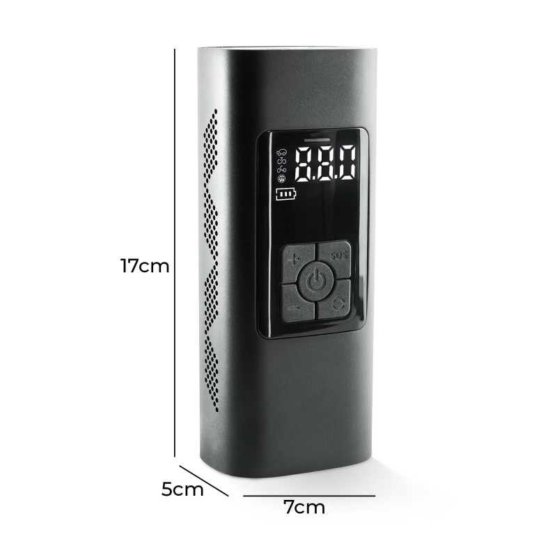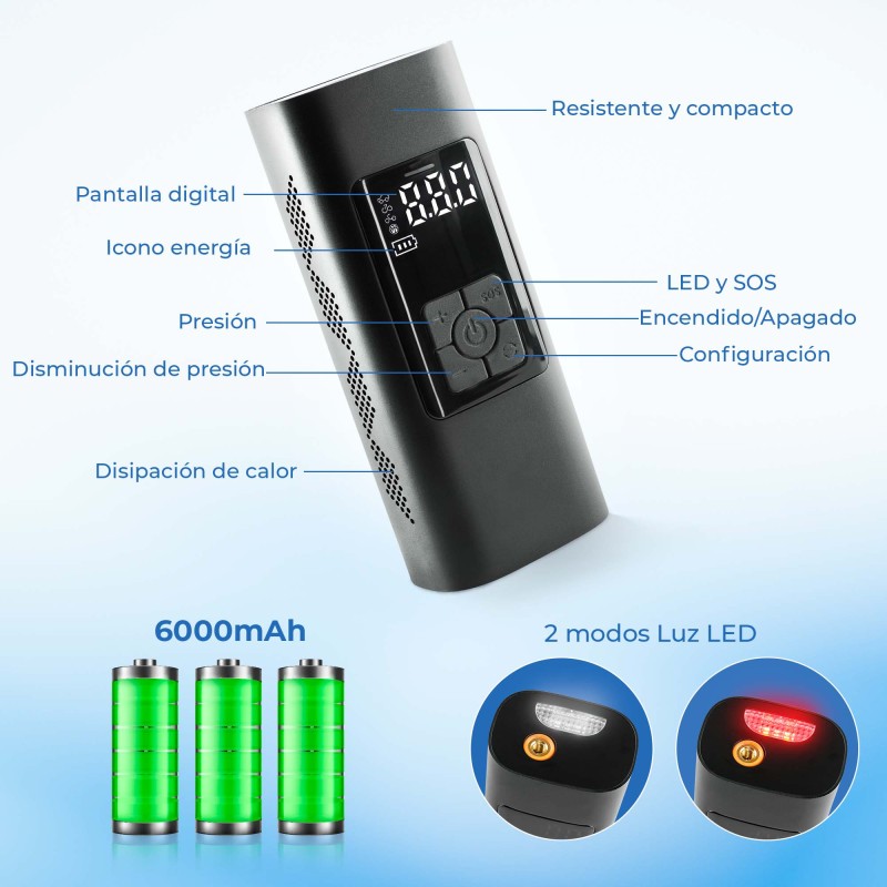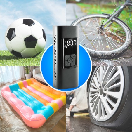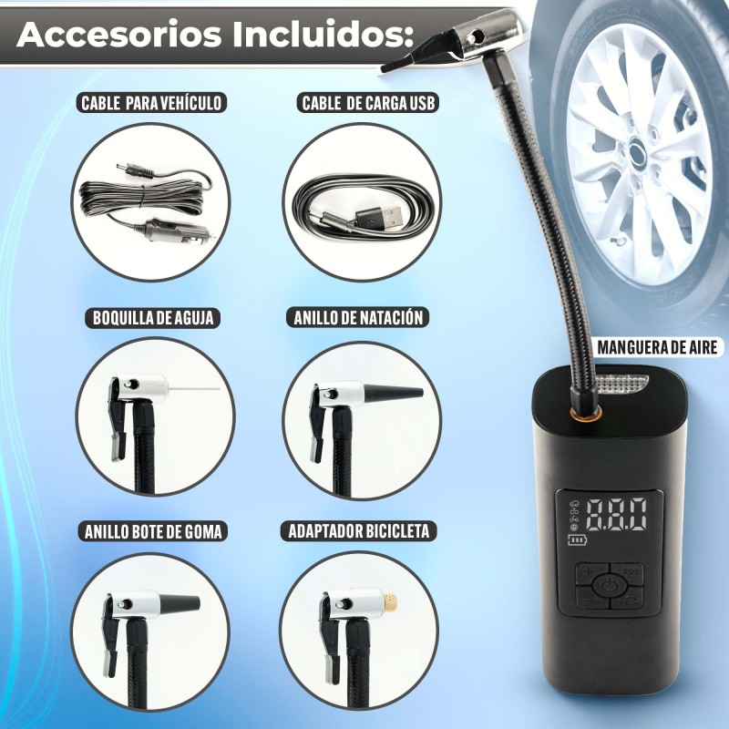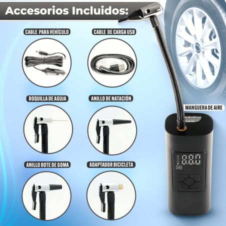Inflador Portátil de Llantas - Compresor de Aire para Carro ¡Gracias por elegir nuestro inflador de llantas portátil inalámbrico e inteligente! Este compresor de aire para carro es la solución perfecta para inflar automóviles, motocicletas, bicicletas, coches eléctricos, pelotas y pequeños juguetes inflables. También funciona como medidor de presión de neumáticos y linterna. # Beneficios: - Inflado automático: Presión de neumáticos preestablecida y parada automática. - Actualización 2020: Núcleo inflable mejorado para mayor eficiencia. - Uso nocturno seguro: Luz de trabajo nocturna integrada. - Fuente de energía baja: Funciona incluso con batería baja del vehículo. # Especificaciones: - Pantalla LCD inteligente: Fácil configuración de presión. - Unidades de presión: PSI, BAR, KPA, KG/CM². - Operación segura: Se detiene automáticamente al alcanzar la presión deseada. - Batería de larga duración: Carga completa en 3-5 horas. - Resistente: A prueba de agua y golpes. # Accesorios Incluidos: - Manguera de aire. - Cable de carga USB. - Cable de alimentación para vehículo. - Boquillas de conversión para bicicleta, anillo de natación y bote de goma. - Boquilla de aguja. - Bolsa de terciopelo para transporte. Este mini compresor de aire es perfecto para cualquier situación de emergencia en carretera y es un excelente regalo para ti o tus seres queridos. ¡Compra ahora y disfruta de la comodidad y seguridad que ofrece este inflador de llantas portátil!