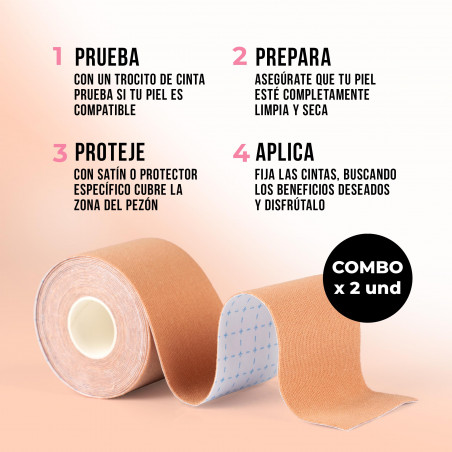 Para usar la cinta corporal es necesario limpiar la piel primero, libre de cualquier humectante o aceite. Luego cortar la cantidad necesaria para tapar y levantar los senos. Una vez cortada la cinta levanta busto, se debe pegar al pecho, levantando a mitad del papel en la parte posterior de la cinta, al retirar el papel restante, levantar el pecho para pegar la cinta. Repetir estos pasos hasta lograr la apariencia deseada.