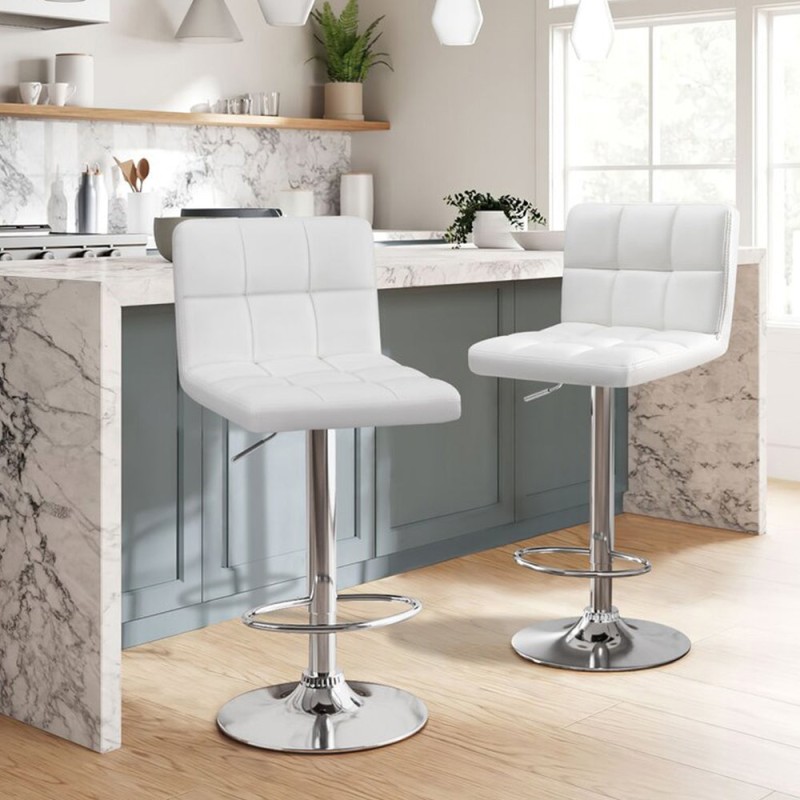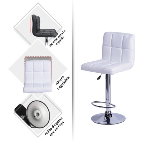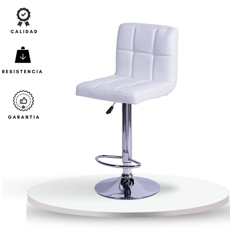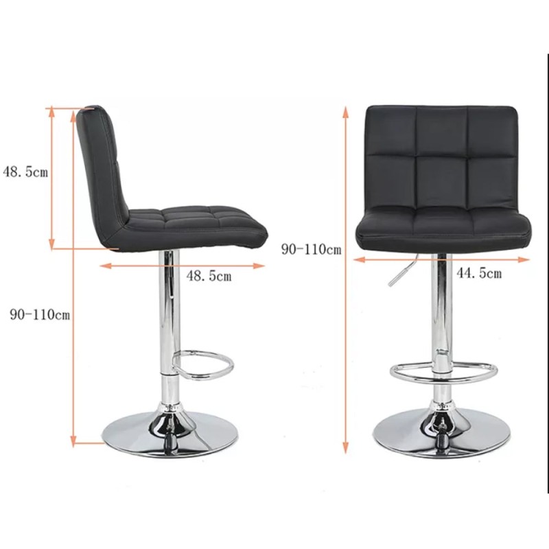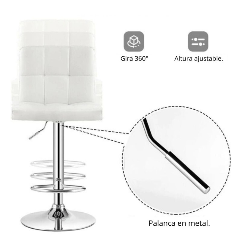 La Silla de Bar Leo combina funcionalidad y estilo con un diseño moderno ideal para cocinas, bares, centros de belleza o como elemento decorativo. Su asiento y espaldar están tapizados en tela tipo cuero, ofreciendo un acabado elegante y fácil de mantener. Cuenta con una base circular cromada con goma antideslizante de 39 cm de diámetro, que garantiza estabilidad. Es giratoria con rotación de 360° y regulable en altura mediante una práctica palanca ubicada bajo el asiento. Además, incluye un reposa pies cromado integrado para mayor confort. Altura ajustable de 94 a 114 cm.