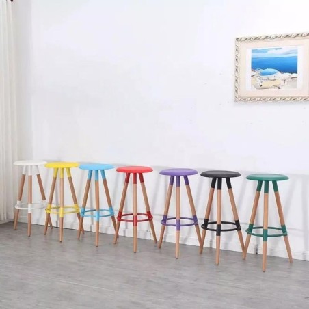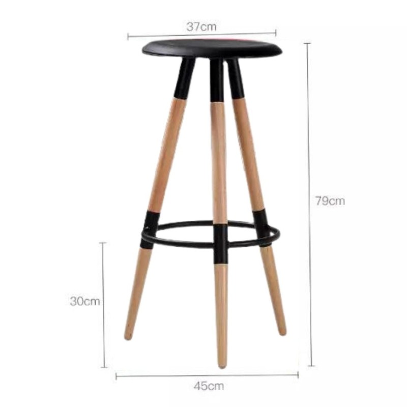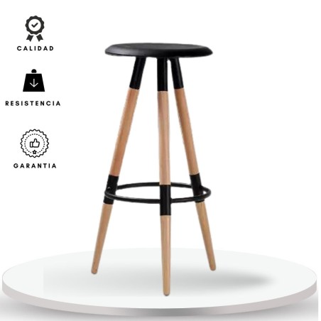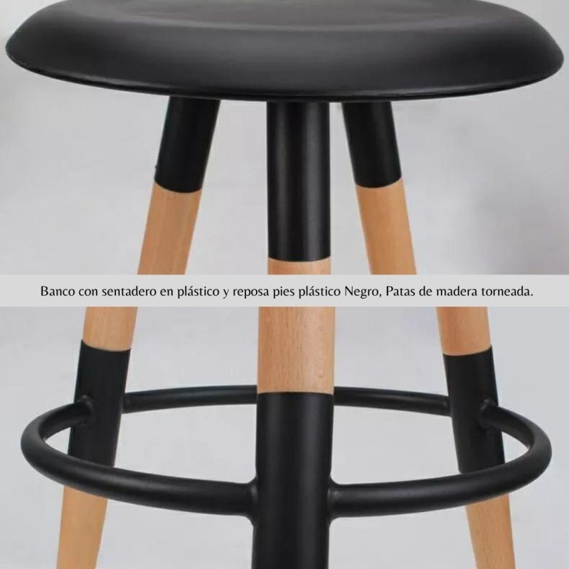Este banco combina funcionalidad y estilo con un diseño simple y moderno. Cuenta con un asiento y reposa pies en plástico blanco, que brindan comodidad y fácil mantenimiento. Su estructura se apoya sobre patas de madera torneada, aportando un toque natural y decorativo al espacio. Ideal para barras de cocina o zonas sociales.
