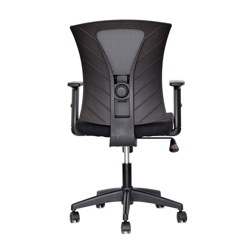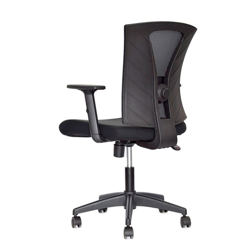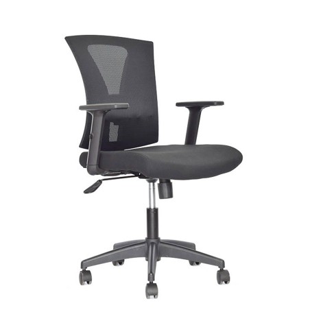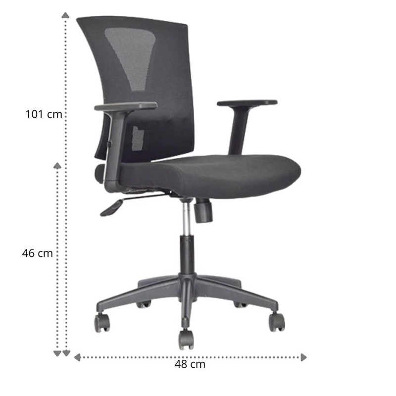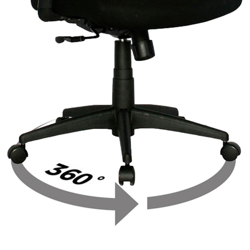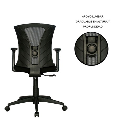 Silla Turmanila Gerente con diseño ergonómico y funcional. Cuenta con asiento tapizado en paño y espaldar en malla nylon, ofreciendo frescura y comodidad durante la jornada. Su base es de nylon con rodachinas tipo Europa para un desplazamiento suave. Es una silla giratoria con rotación de 360° y ajuste de altura mediante palanca metálica ubicada bajo el asiento. Incorpora soporte lumbar regulable en altura y profundidad para mayor confort, mecanismo basculante y brazos en polipropileno ajustables en altura. Ideal para espacios de oficina que requieren confort y movilidad.