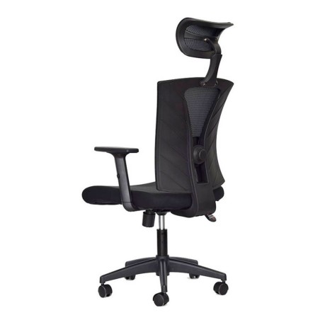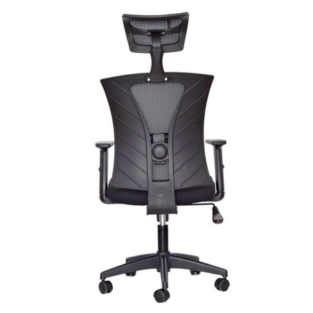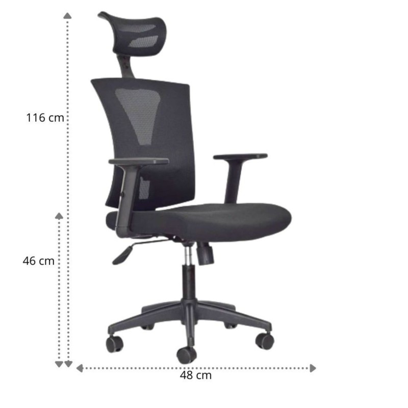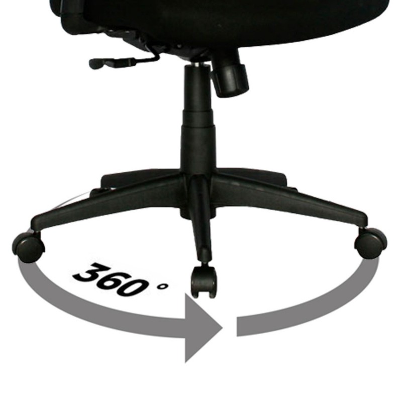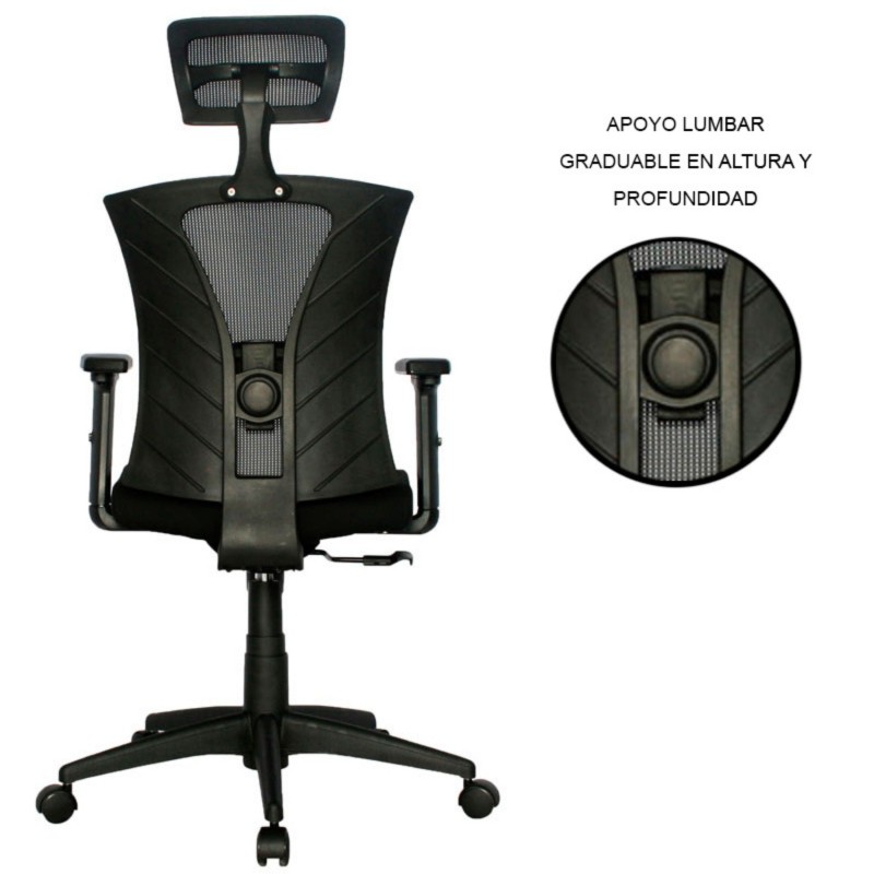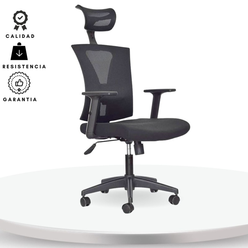 Silla Turmanila Presidente, diseñada para brindar ergonomía y confort en espacios ejecutivos. Cuenta con espaldar alto con marco perimetral en polipropileno, tapizado en malla tensada, y cabecero ajustable en ángulo y altura. El asiento, tapizado en paño, es regulable en altura mediante palanca, y está complementado por un soporte lumbar ajustable en altura y profundidad. Incorpora mecanismo basculante con una posición de bloqueo y regulación de tensión mediante perilla. Su base de nylon con rodachinas tipo Europa y ruedas en nylon permiten una rotación de 360° y desplazamiento suave. Los brazos, también en polipropileno, son ajustables en altura para mayor comodidad.