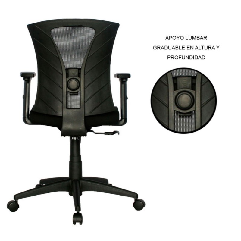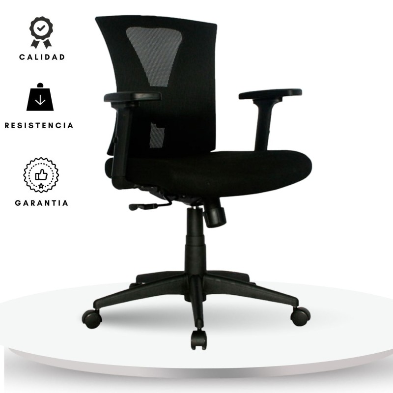 La Silla de Oficina Turmanila Gerente Premium ofrece una combinación ideal de ergonomía y confort. Cuenta con un espaldar alto con marco en polipropileno de alto impacto, tapizado en malla traslúcida color negro, que brinda frescura y soporte. El asiento está elaborado con espuma de alta densidad y tapizado en paño, con regulación de altura mediante palanca que activa el cilindro neumático. Incorpora un mecanismo sincro con cuatro bloqueos, que permite ajustar la inclinación según las necesidades del usuario. Sus brazos 3D, fabricados en polipropileno, son regulables en altura, giro y profundidad. Además, cuenta con base en nylon resistente y ruedas en nylon de suave desplazamiento, ideal para un entorno de oficina dinámico.