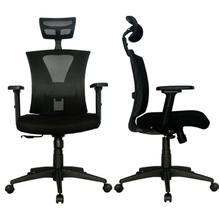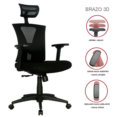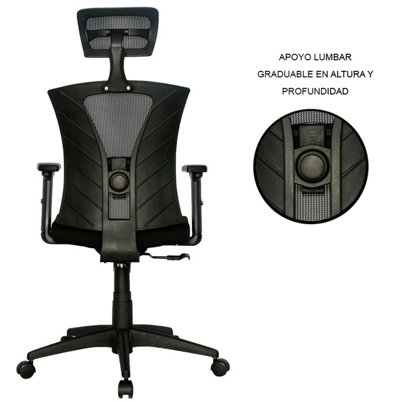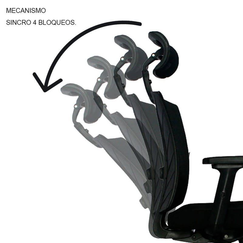 La Silla Turmanila Premium combina diseño ergonómico y funcionalidad para brindar máxima comodidad. Cuenta con espaldar alto con marco en polipropileno de alto impacto, tapizado en malla traslúcida color negro, y cabecero ajustable en altura e inclinación, también tapizado en malla. El asiento, con espuma de alta densidad, está tapizado en paño y cuenta con regulación de altura mediante cilindro neumático. Su mecanismo sincro permite cuatro posiciones de bloqueo, brindando mayor adaptabilidad al usuario. Incorpora brazos 3D en polipropileno, ajustables en altura, giro y profundidad, ruedas en nylon de suave desplazamiento y base en nylon resistente. Ideal para jornadas prolongadas en oficina.