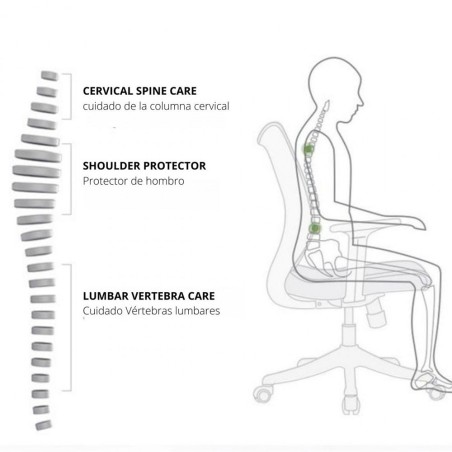 La silla de oficina Espina de Pescado es una excelente opción ergonómica con diseño moderno. Cuenta con espaldar alto en malla traslúcida, con marco en polipropileno de alto impacto. Su asiento está fabricado en espuma de alta densidad y tapizado en paño, con sistema de graduación de altura mediante palanca y cilindro neumático. Incorpora un mecanismo basculante con bloqueo de inclinación y perilla para ajustar la tensión. Dispone de brazos 3D graduables en altura y fabricados en polipropileno, ruedas en nylon de alta resistencia y base en nylon que garantizan movilidad y estabilidad.