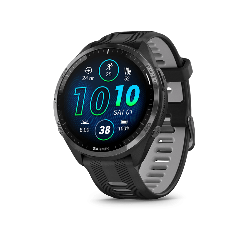 Garmin Forerunner 965: El reloj definitivo para corredores y triatletas El Garmin Forerunner 965 es un reloj inteligente con GPS diseñado para deportistas apasionados que buscan llevar su entrenamiento al siguiente nivel. Este modelo premium combina un diseño elegante y ligero con tecnología de vanguardia, convirtiéndose en una herramienta esencial para corredores, triatletas y amantes del fitness. Disponible en tres combinaciones de colores (negro/gris polvo, blanco piedra/amarillo AMP y carbono gris/titanio), el Forerunner 965 destaca por su estilo y funcionalidad, perfecto tanto para el asfalto como para la vida diaria. Características destacadas Pantalla AMOLED de alta calidad: Su pantalla táctil AMOLED de 1.4 pulgadas (454 x 454 píxeles) ofrece colores vibrantes y una nitidez excepcional, incluso bajo luz solar intensa. Protegida por Gorilla Glass 3 y enmarcada por un bisel de titanio, garantiza resistencia y una experiencia visual superior. Batería de larga duración: Con hasta 23 días en modo smartwatch, 7 días con pantalla siempre encendida o 31 horas con GPS activado, este reloj está preparado para acompañarte en tus entrenamientos más exigentes sin necesidad de recargas frecuentes. Monitoreo avanzado de salud y recuperación: Training Readiness: Evalúa tu disposición para entrenar según sueño, recuperación, carga de entrenamiento y estado HRV, ayudándote a decidir si es momento de esforzarte o descansar. Morning Report: Recibe cada mañana un resumen personalizado con datos de sueño, recuperación, clima y más (al vincularlo con tu smartphone). Body Battery: Monitorea tus niveles de energía para optimizar tus actividades diarias. Sueño avanzado: Analiza etapas de sueño (ligero, profundo, REM), detecta siestas y ofrece un puntaje de calidad. Herramientas para corredores y triatletas: Más de 30 perfiles deportivos preinstalados, incluyendo running, ciclismo, natación y triatlón, con transiciones automáticas para multisport. Running Dynamics: Mide cadencia, longitud de zancada, tiempo de contacto con el suelo y potencia de carrera desde la muñeca, sin sensores adicionales. Mapas integrados: Navega con mapas a color y mayor detalle al hacer zoom, ideal para explorar nuevas rutas. Garmin Coach: Planes de entrenamiento gratuitos y adaptativos para 5K, 10K o maratones, con predicciones de tiempo de carrera basadas en tu rendimiento. Conectividad y funciones inteligentes: Garmin Pay: Paga sin contacto en tiendas o transporte público compatible. Música sin teléfono: Descarga playlists de Spotify, Amazon Music o Deezer y disfruta de hasta 2,000 canciones con auriculares Bluetooth. Notificaciones: Recibe alertas de tu smartphone y responde mensajes (solo Android). Seguridad: Detección de incidentes y asistencia para enviar tu ubicación en emergencias (requiere conexión con smartphone). Diseño premium y personalización: Con un peso de solo 53 gramos y una correa de silicona intercambiable de 22 mm, este reloj es cómodo y resistente al agua (5 ATM). Personalízalo con apps y watch faces desde Connect IQ.