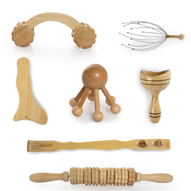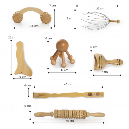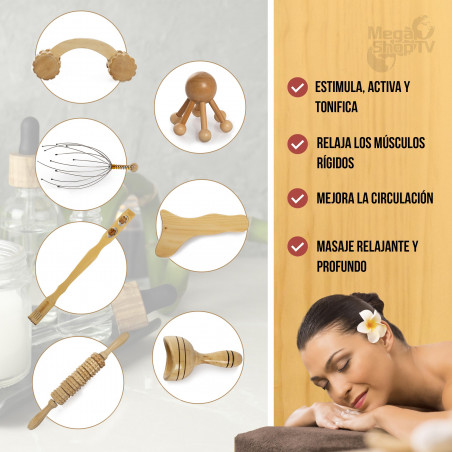 Este Kit de maderoterapia con 7 masajeadores incluye: