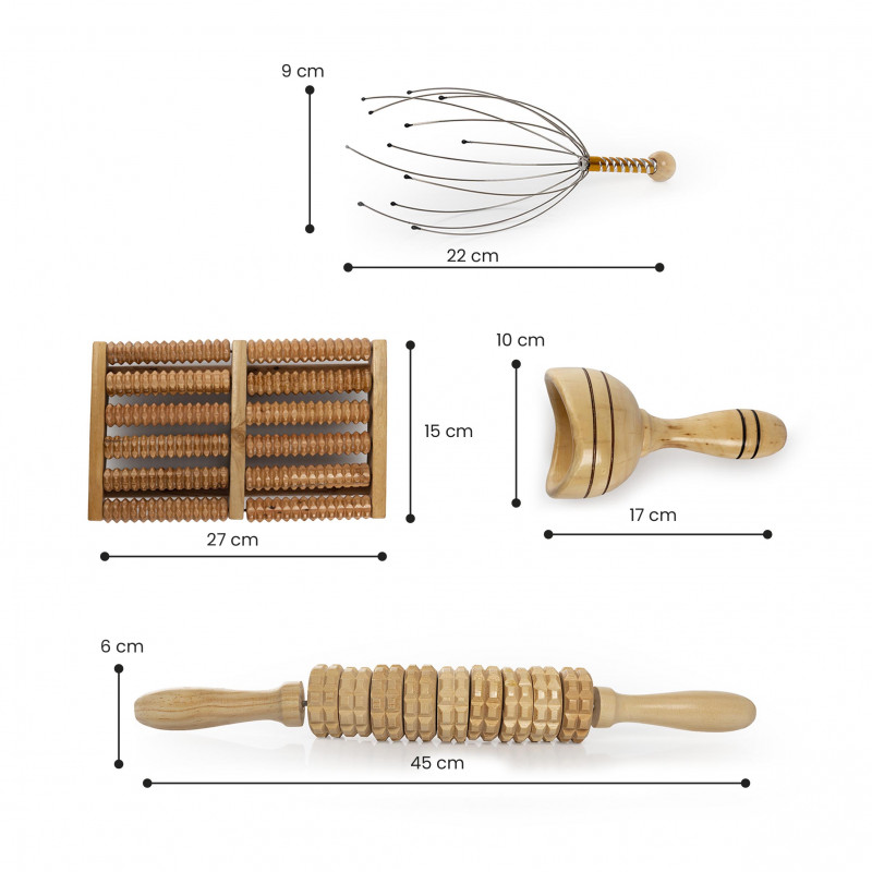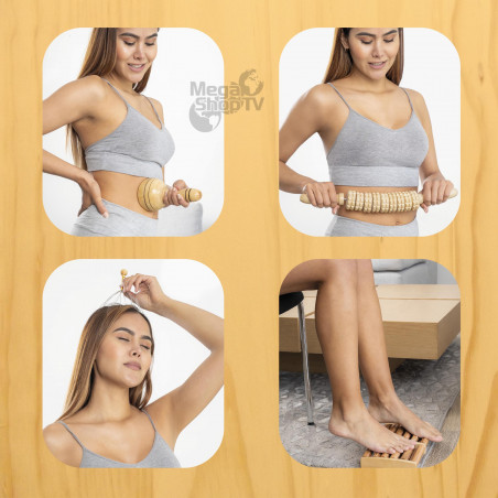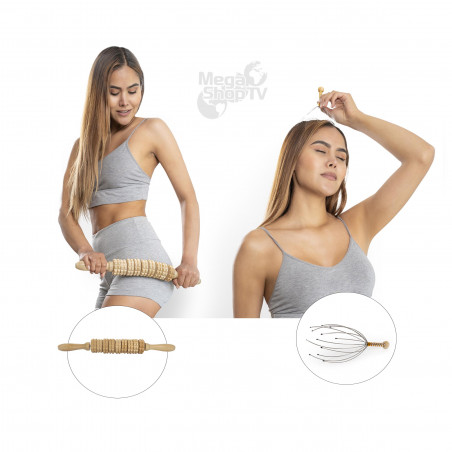 Con este kit de maderoterapia vas a estimular, activar y tonificar tu cuerpo, con diferentes utensilios de madera que se adaptan a las diferentes zonas, con el objetivo de reducir los niveles de estrés, moldear y aliviar los dolores musculares y articulares.